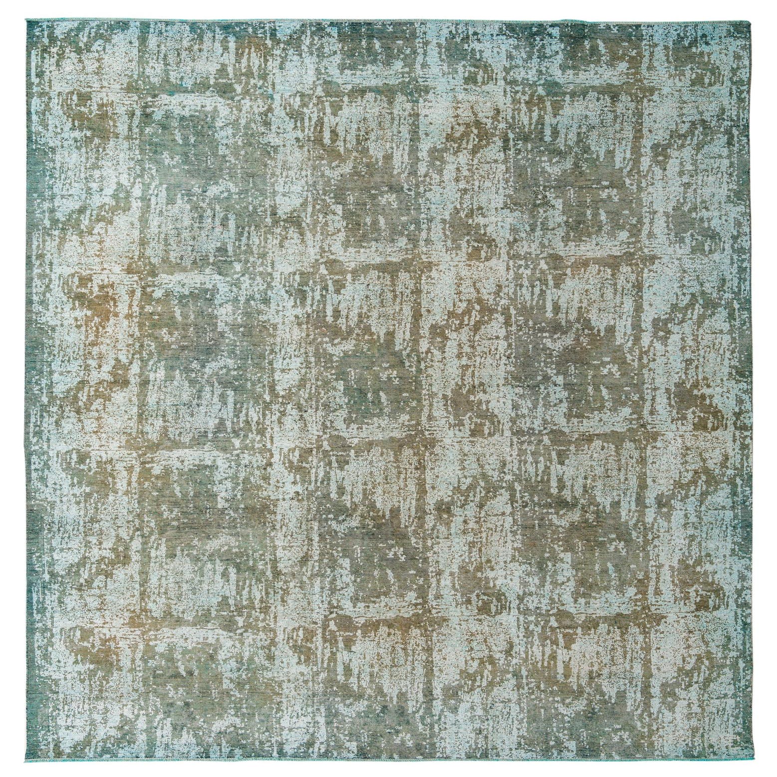A 10x12 rectangular indoor rug with a distressed green, brown, and off-white Persian-modern pattern.