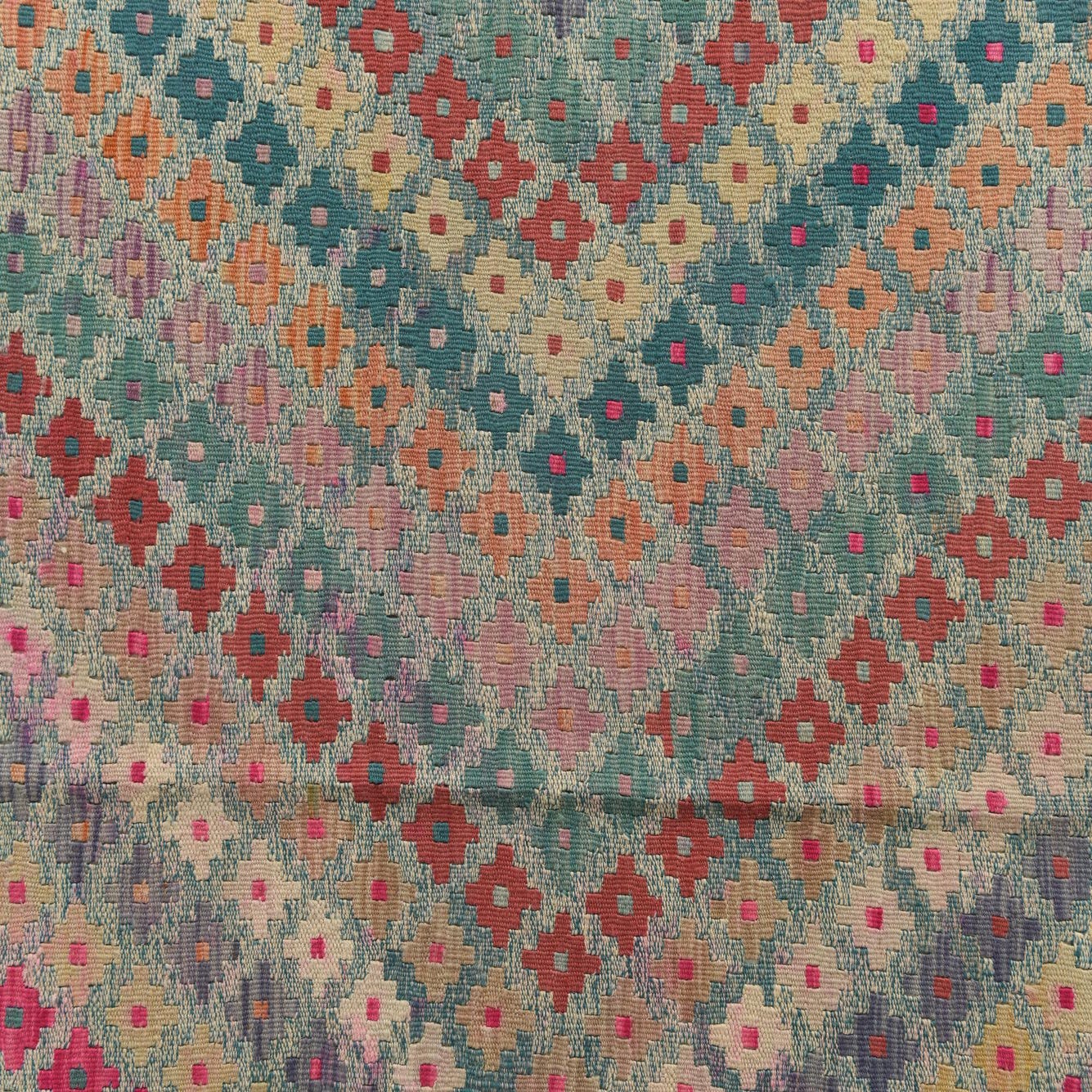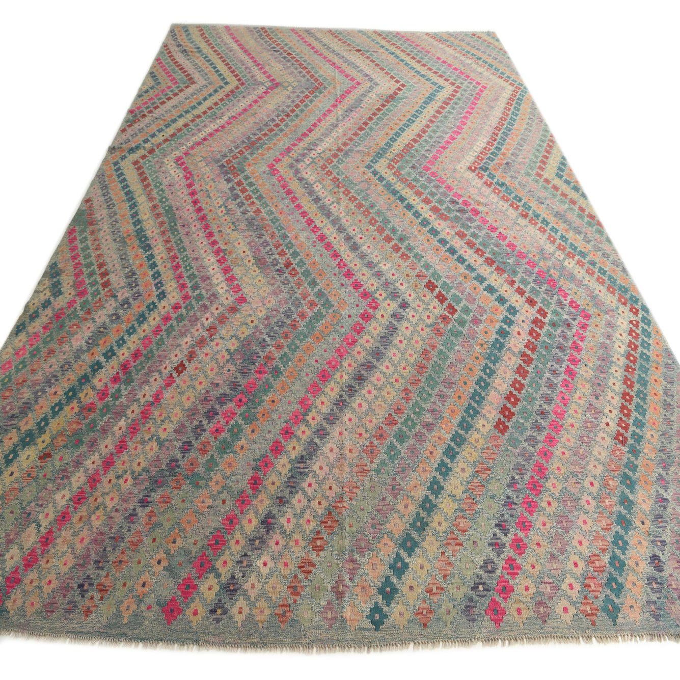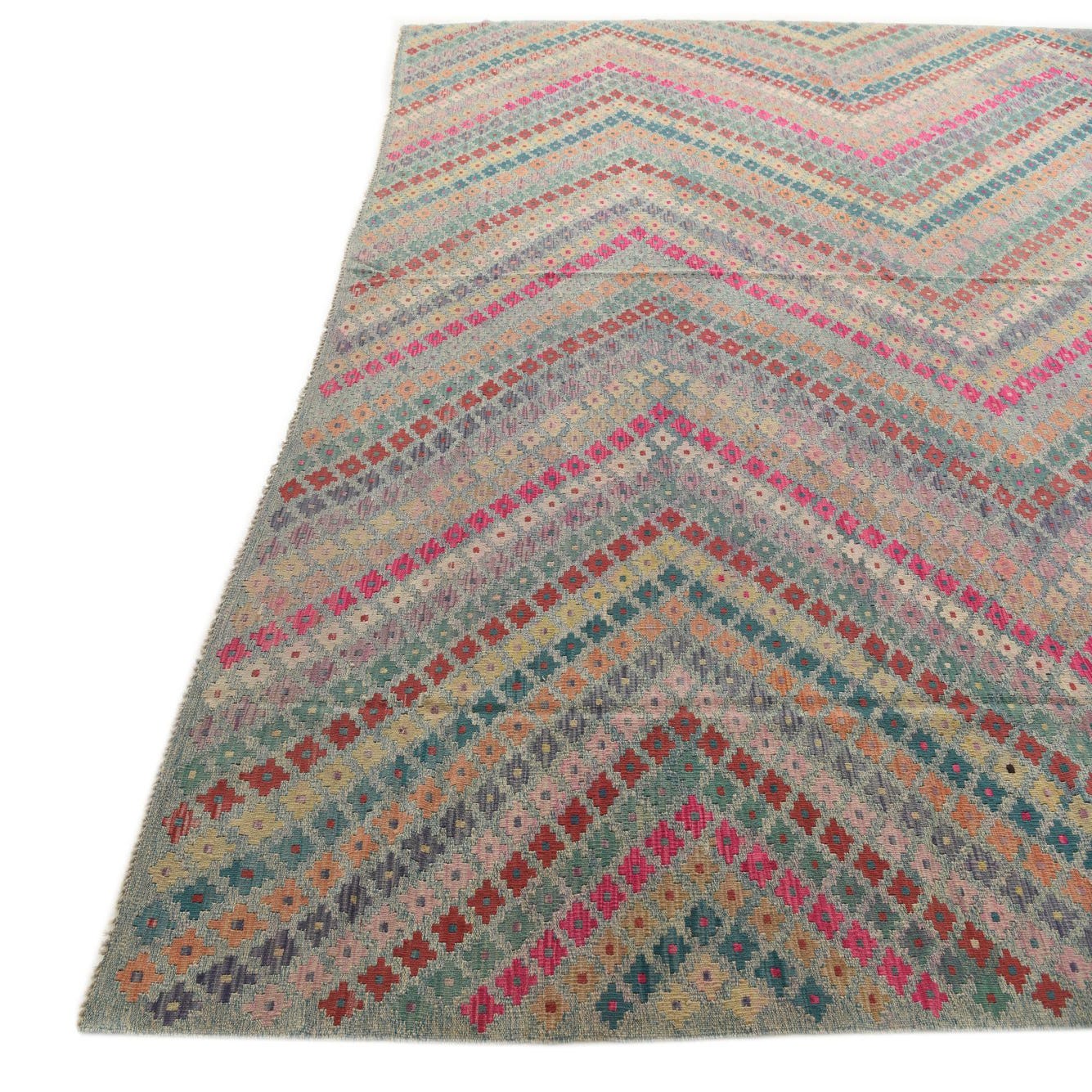 A 10x13 rectangular Kilim Modern wool rug featuring a vibrant chevron pattern in various shades of green, pink, blue, and orange.