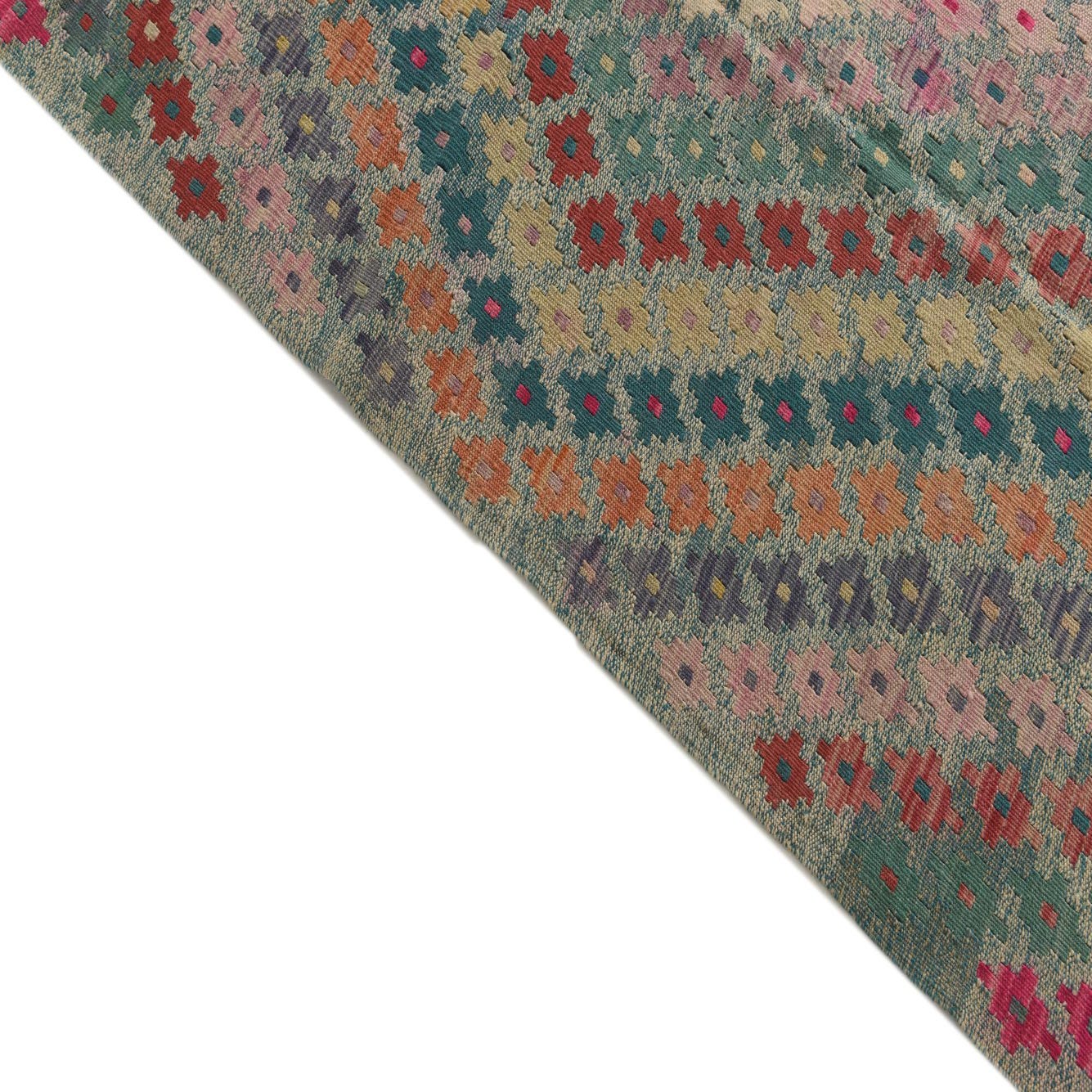 From the Kilim Modern collection, this 10x13 hand-woven wool rug presents a contemporary twist on traditional kilim design, making a statement with its bold geometric patterns and striking color palette. The foundation of the rug is a rich green background, complemented by an array of colors including beige, brown, orange, red, pink, and violet, which converge into a vibrant, multi-directional chevron motif that catches the eye and enlivens any space.