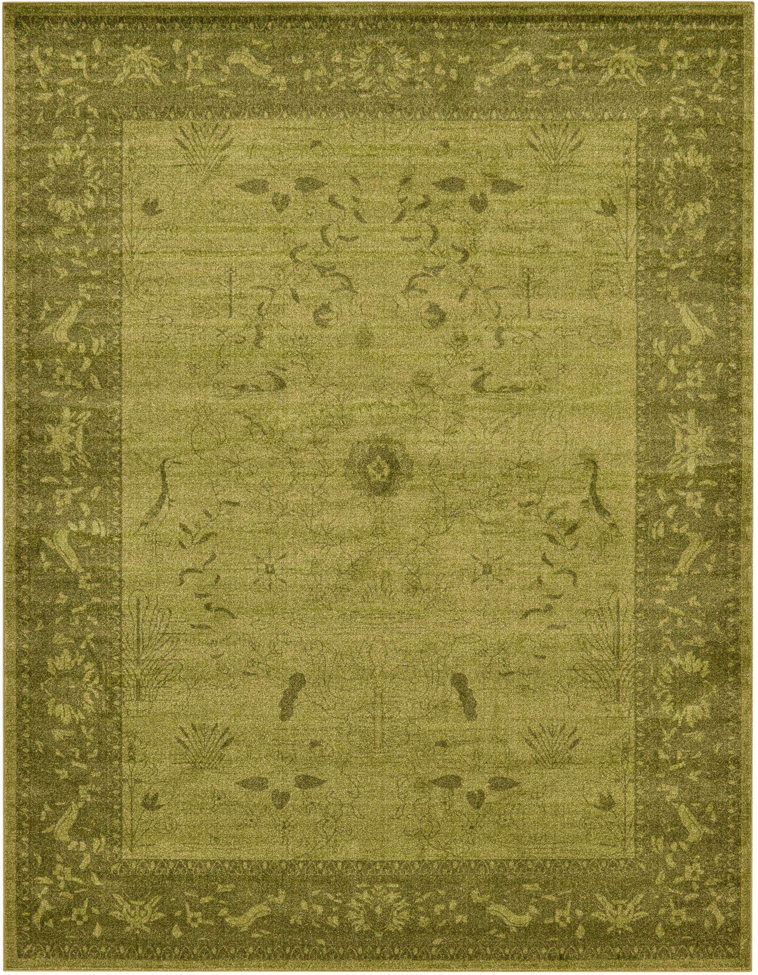 The rug's texture provides a soft underfoot experience while being resistant to stains, contributing to its practicality in high-traffic areas. Its shed-free property ensures that it retains a clean, neat appearance over time. Given the calming color palette, this rug would seamlessly integrate into interiors that favor natural tones or require a grounding element. It would complement spaces with wooden furnishings, neutral tones, or even rooms that harness a range of lively colors, as the green hues can balance and enhance vibrant decors. Suitable for living rooms, dining areas, and bedrooms, this rug is versatile enough to elevate traditional or contemporary settings.