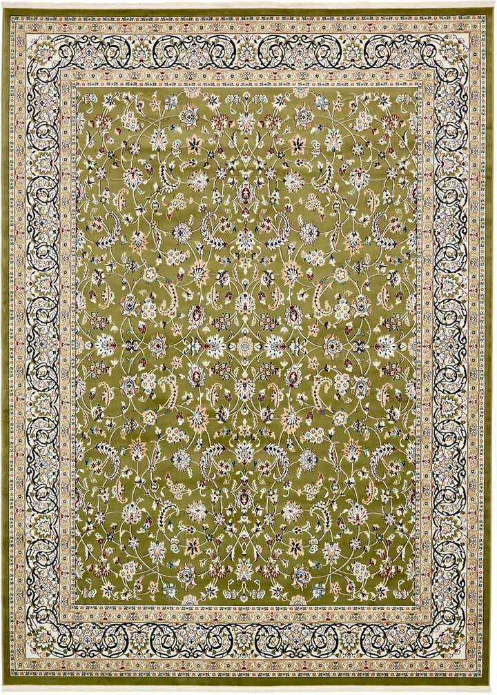 Primary color is Green. Colors in this rug include: Green, Beige, Blue, Burgundy, Cream, Ivory, Navy Blue, Puce.