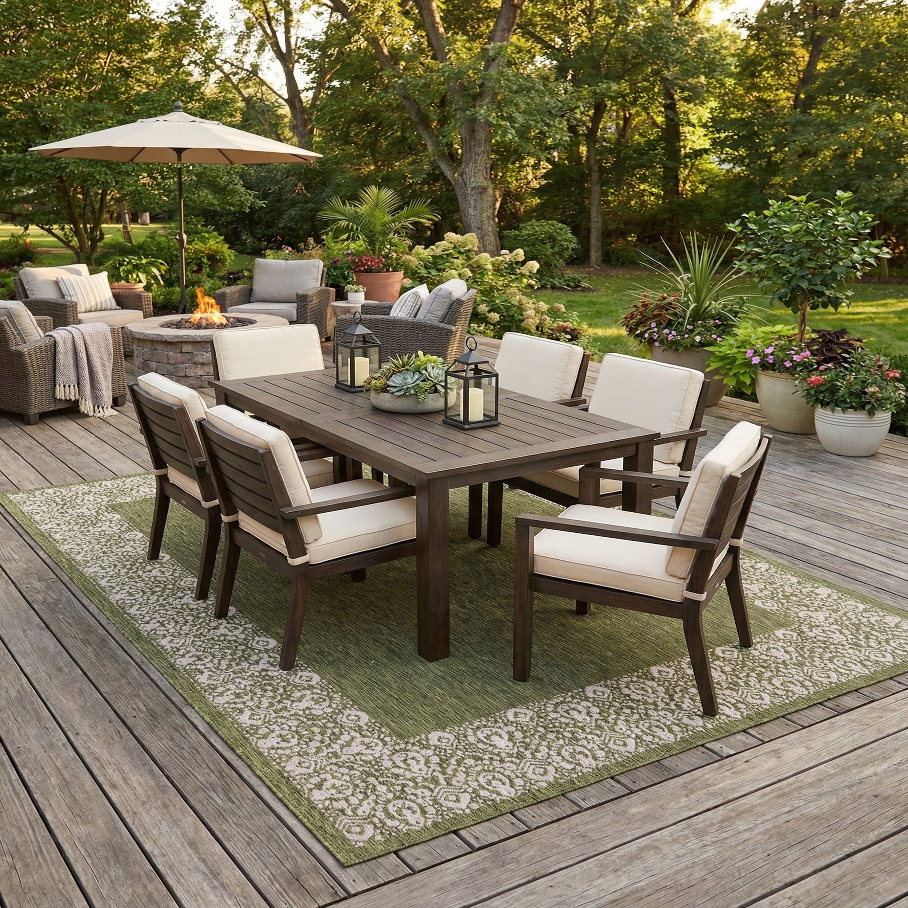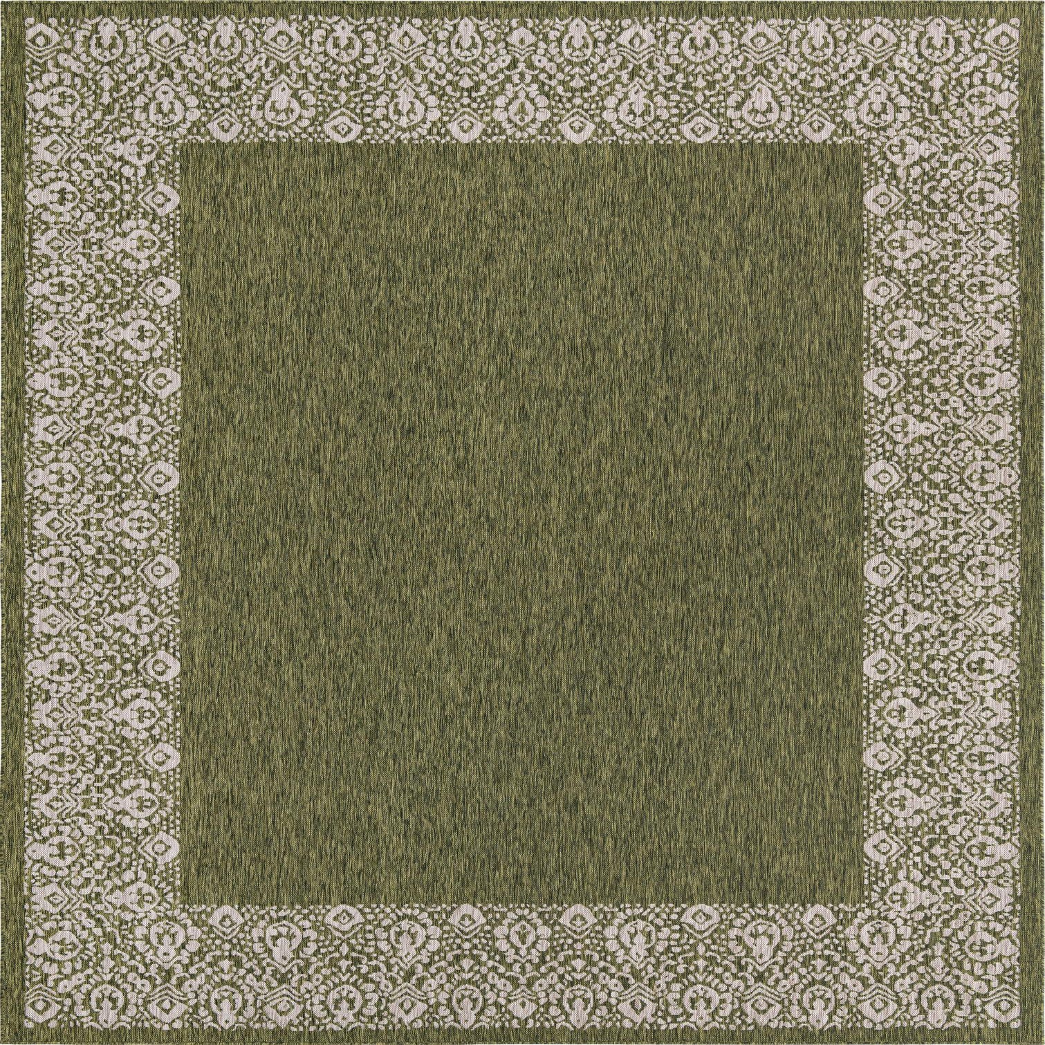 A 10x13 rectangular green indoor/outdoor rug with a light-colored, ornate vintage border pattern.