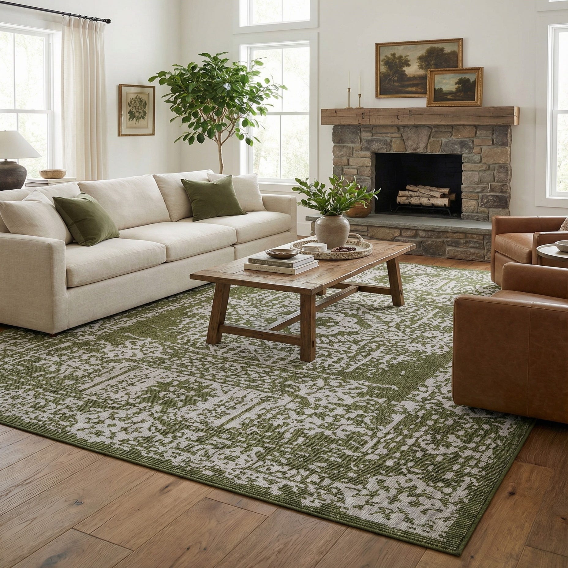 A traditional medallion design sits at the center of a green ground, surrounded by layered borders of floral and geometric motifs rendered in soft gray. The pattern has a deliberately aged, distressed finish so the gray motif interplays with exposed green areas, creating depth and a lived-in character. Machine-made construction yields a low-profile, tightly woven surface with a subtle texture you can feel underfoot—firm and structured rather than plush.