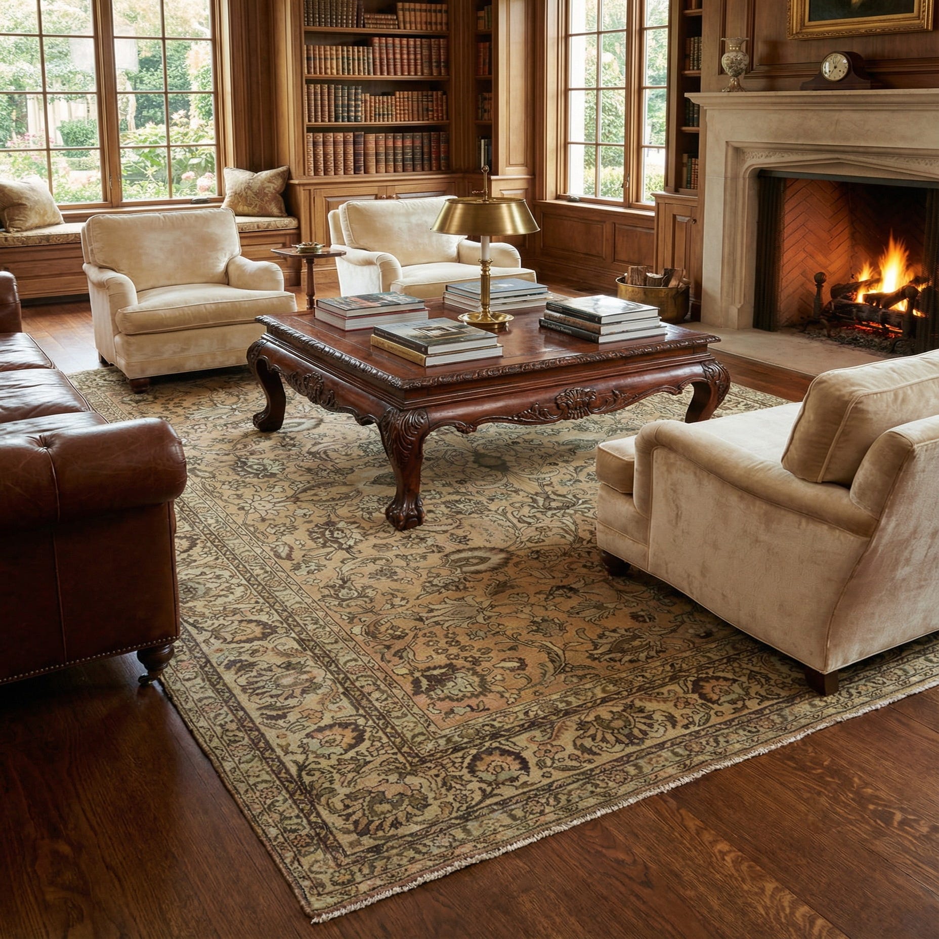 A 10x13 rectangular Persian rug with a medium pile, featuring intricate green and brown floral patterns on a light tan background, suitable for a living room.