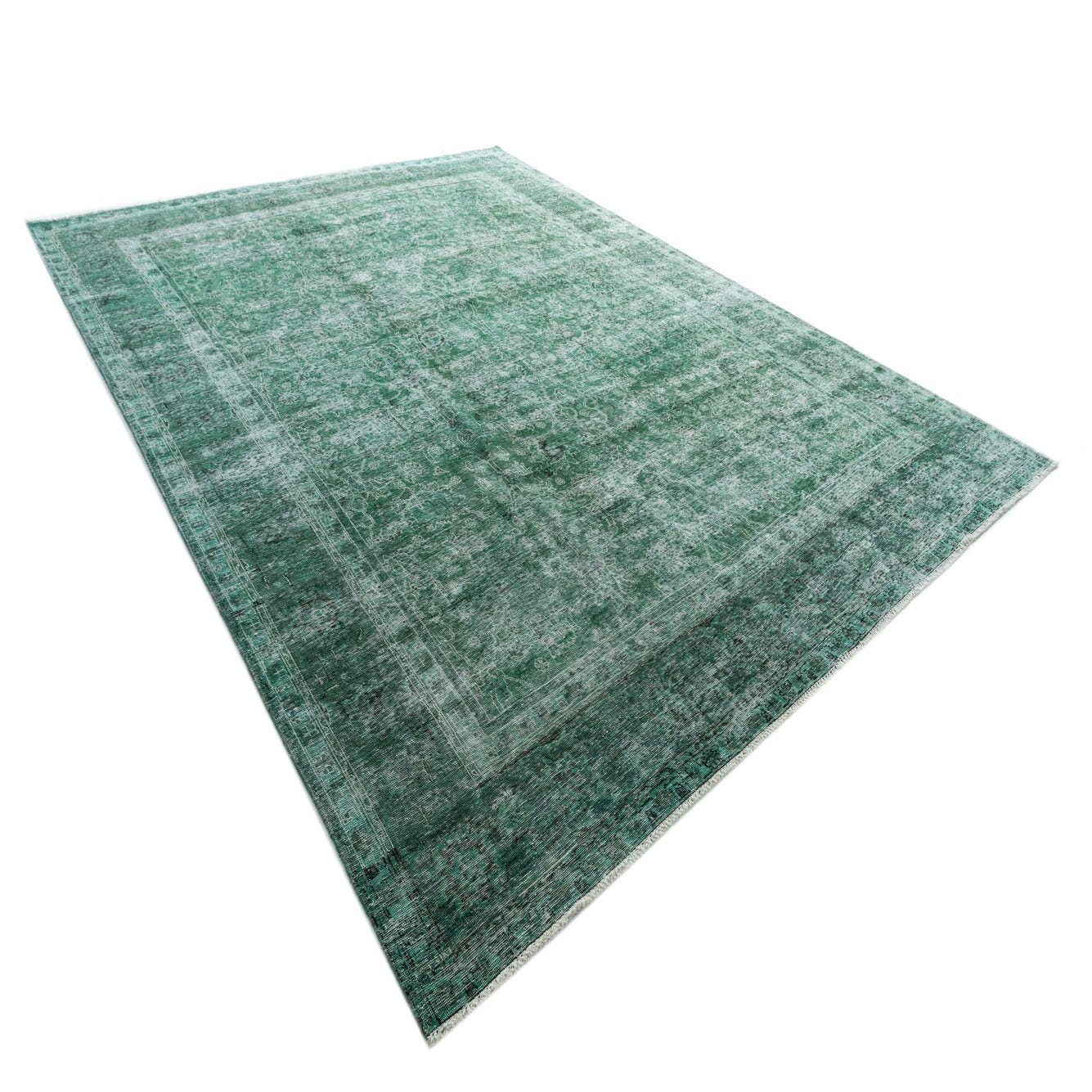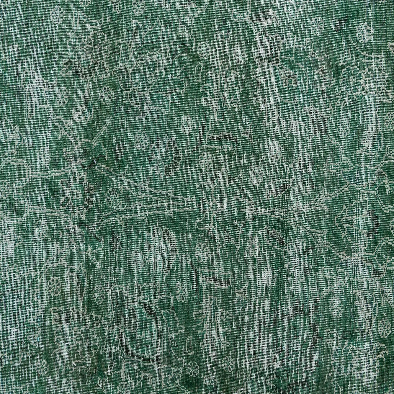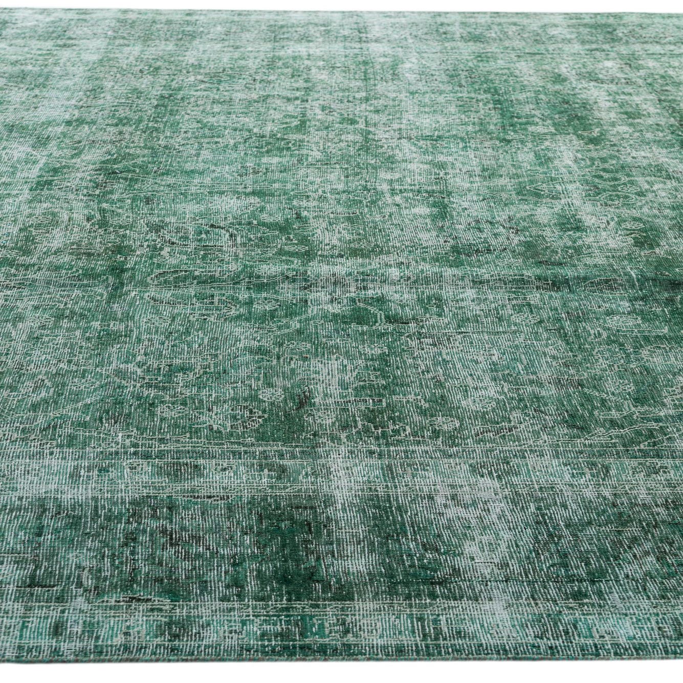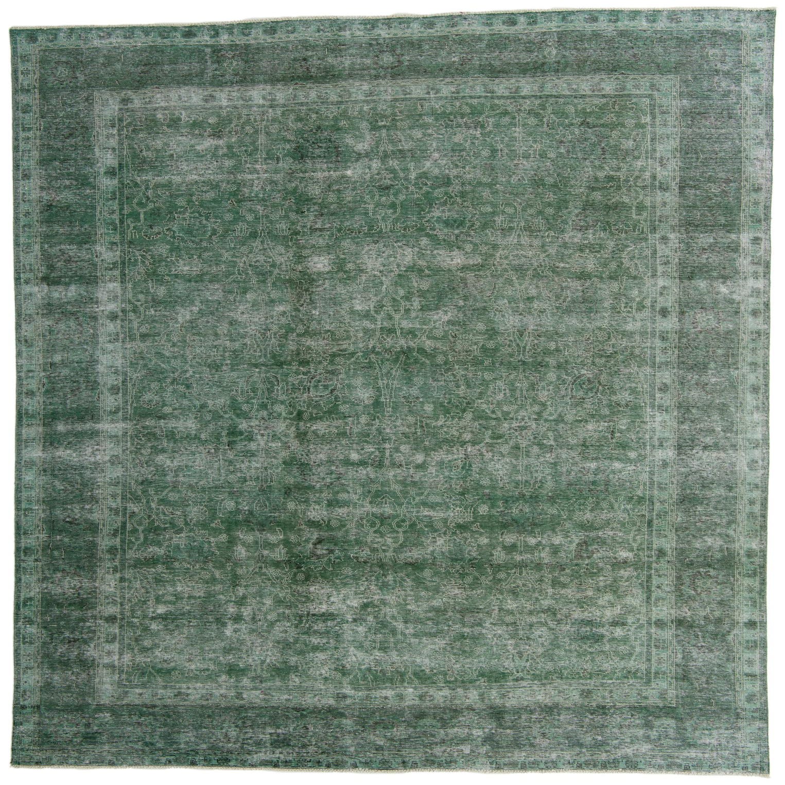 A large 10x13 rectangular green Persian-style wool rug with a distressed vintage look and intricate floral patterns.