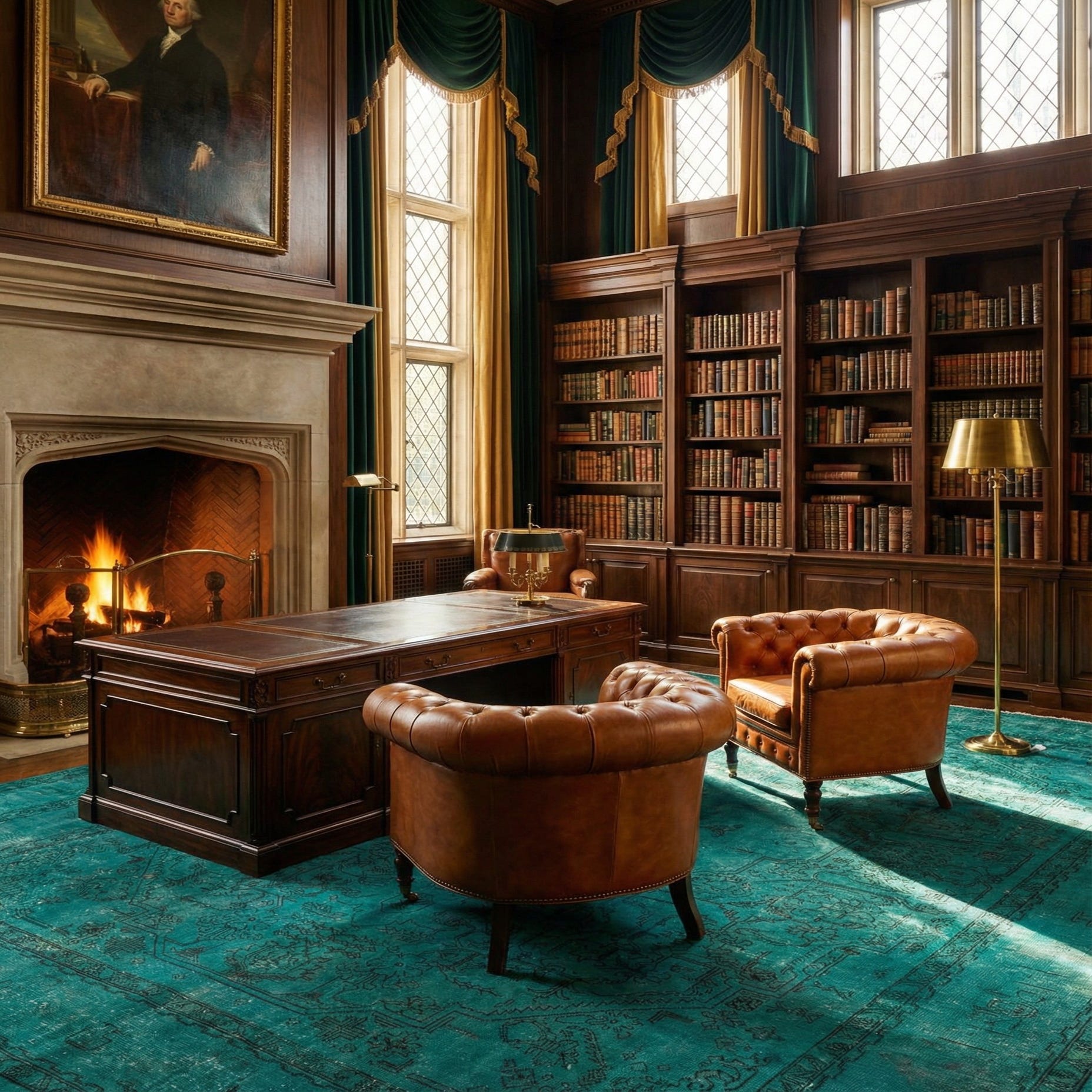 A classic medallion layout and intricate floral-geometric motifs create a traditional, Persian?inspired pattern across a rich green ground, with darker charcoal outlines that pick out the design. The aged finish and layered tones make this piece a natural anchor for a mid-century modern living room with warm wood and leather, a serene bedroom layered with neutral linens, or a study where brass accents and built-ins call for a bold but grounded color statement.