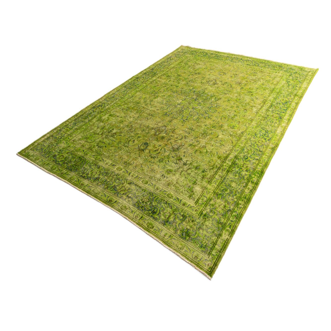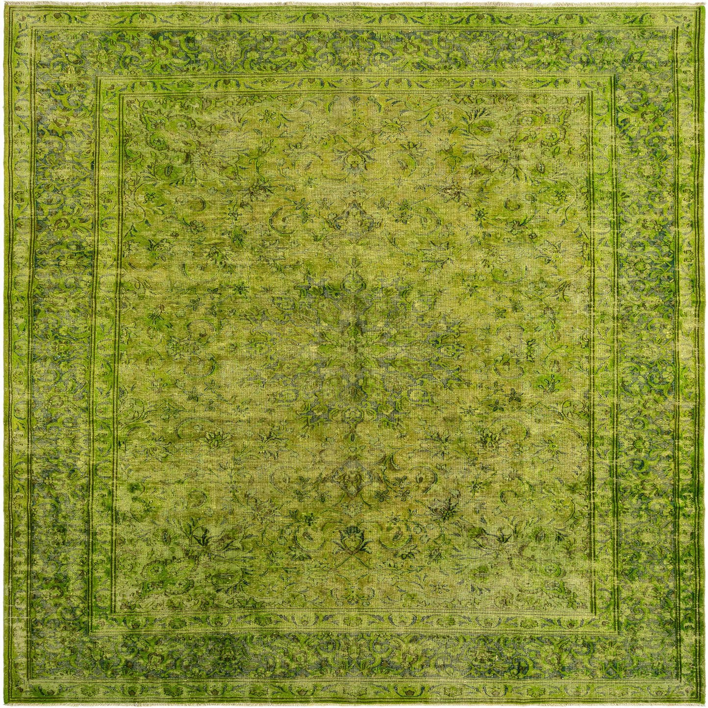 A 10x13 rectangular green Persian wool rug with a distressed floral pattern and intricate border.
