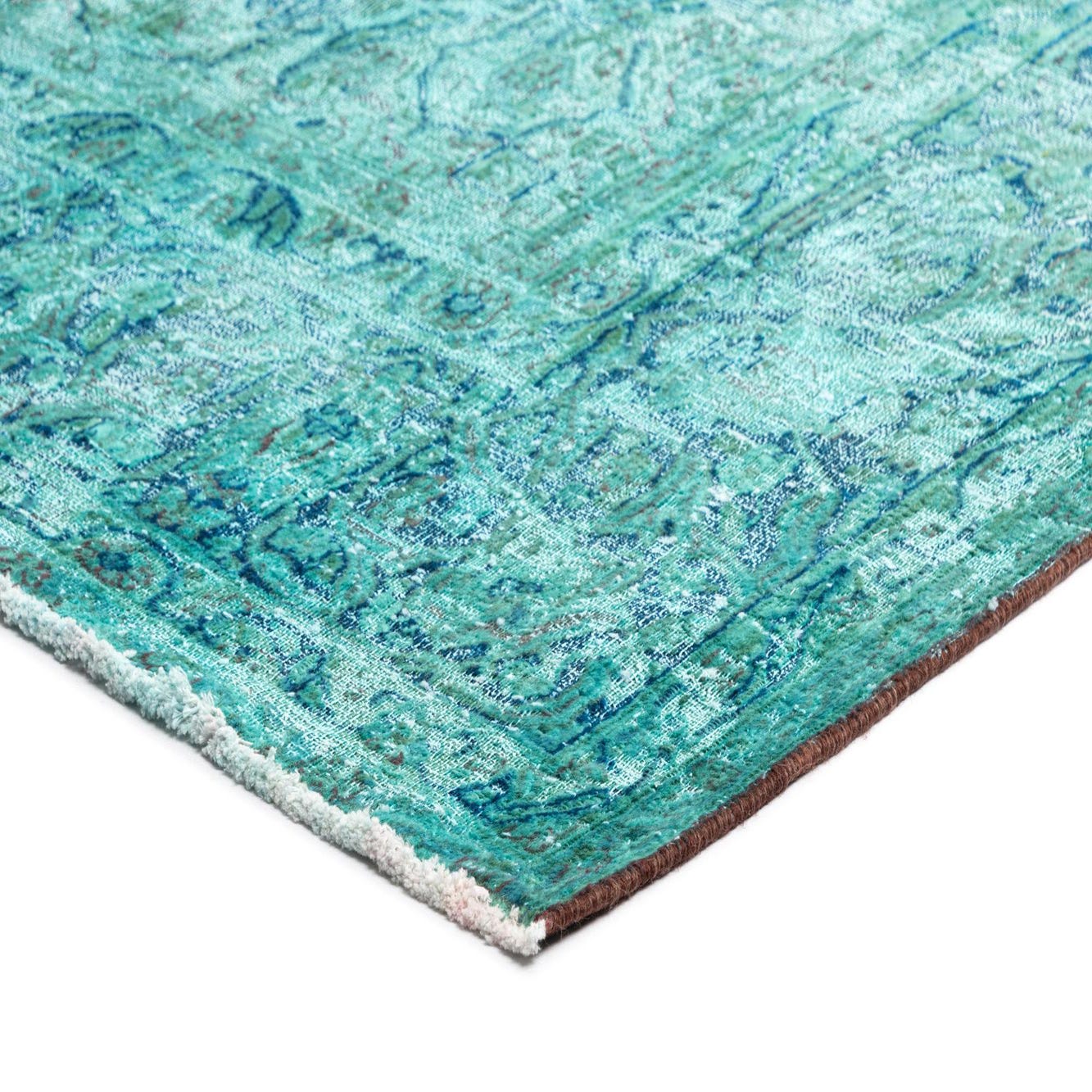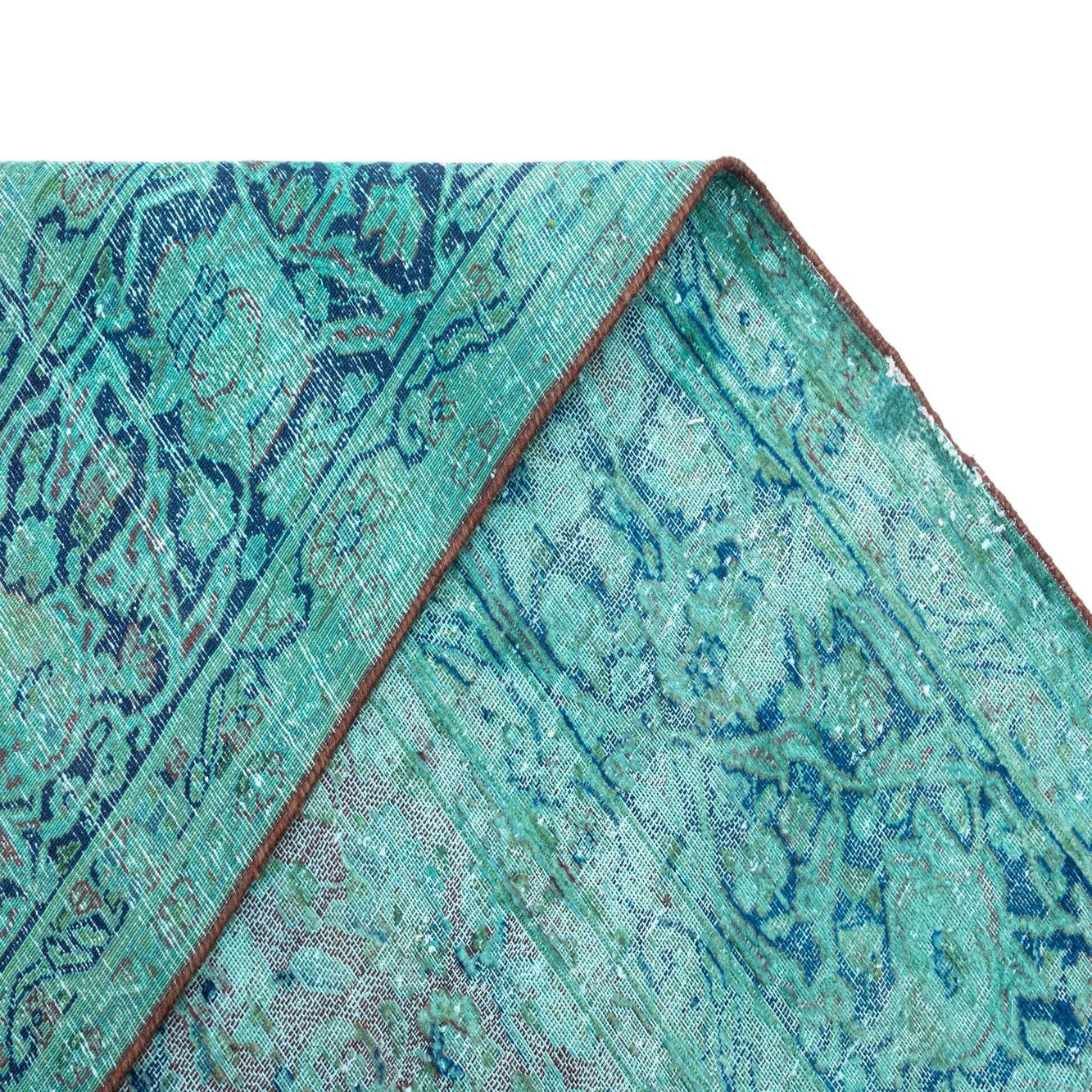 Primary color is Green. Colors in this rug include: Green, Green, Blue, Brown.