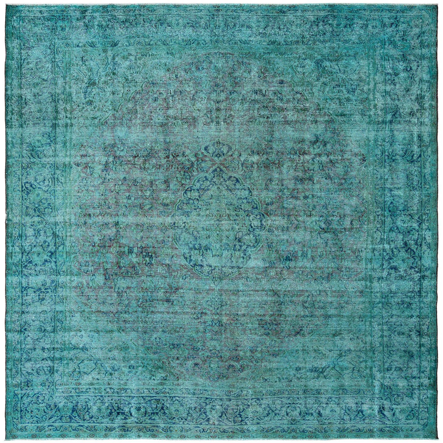 A large 10x13 rectangular green Persian wool rug with a distressed traditional medallion pattern, ideal for a living room.