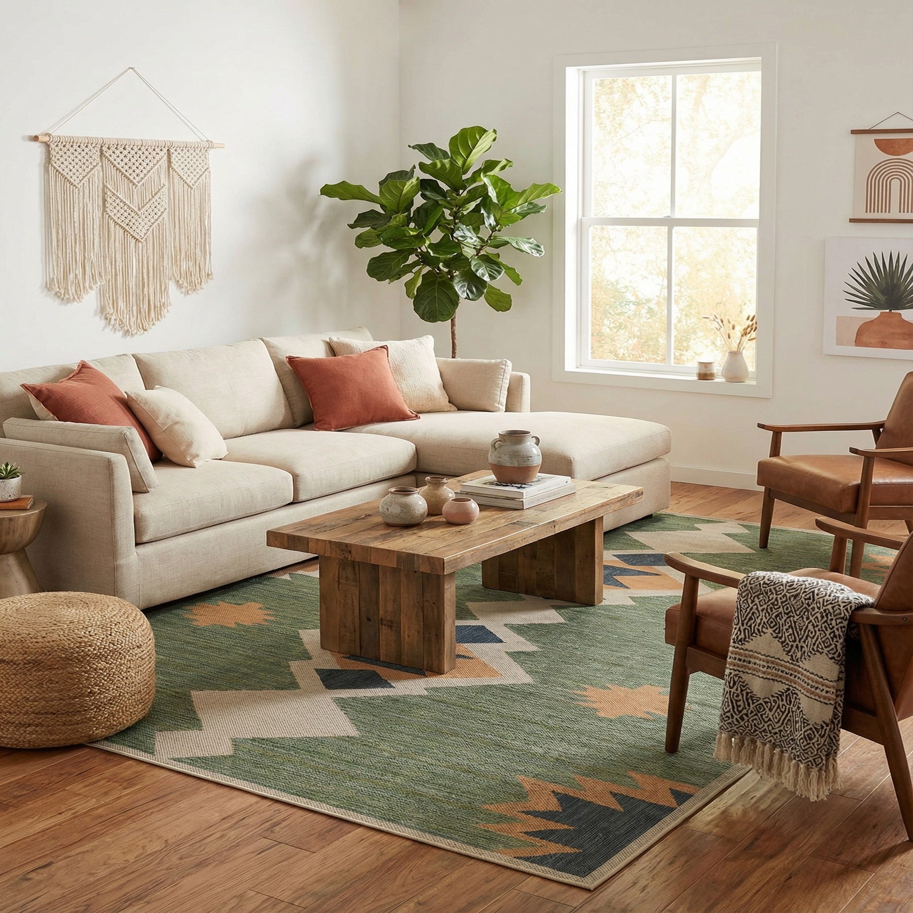 Made for outdoor living, the construction keeps the rug looking tidy on a covered patio or sunroom while also working indoors in casual dining rooms, family rooms, or entryways. Pair it with warm woods and rattan furniture for a laid-back, natural feel, or layer it under a mid-century or farmhouse table to introduce color and pattern without overwhelming the space.