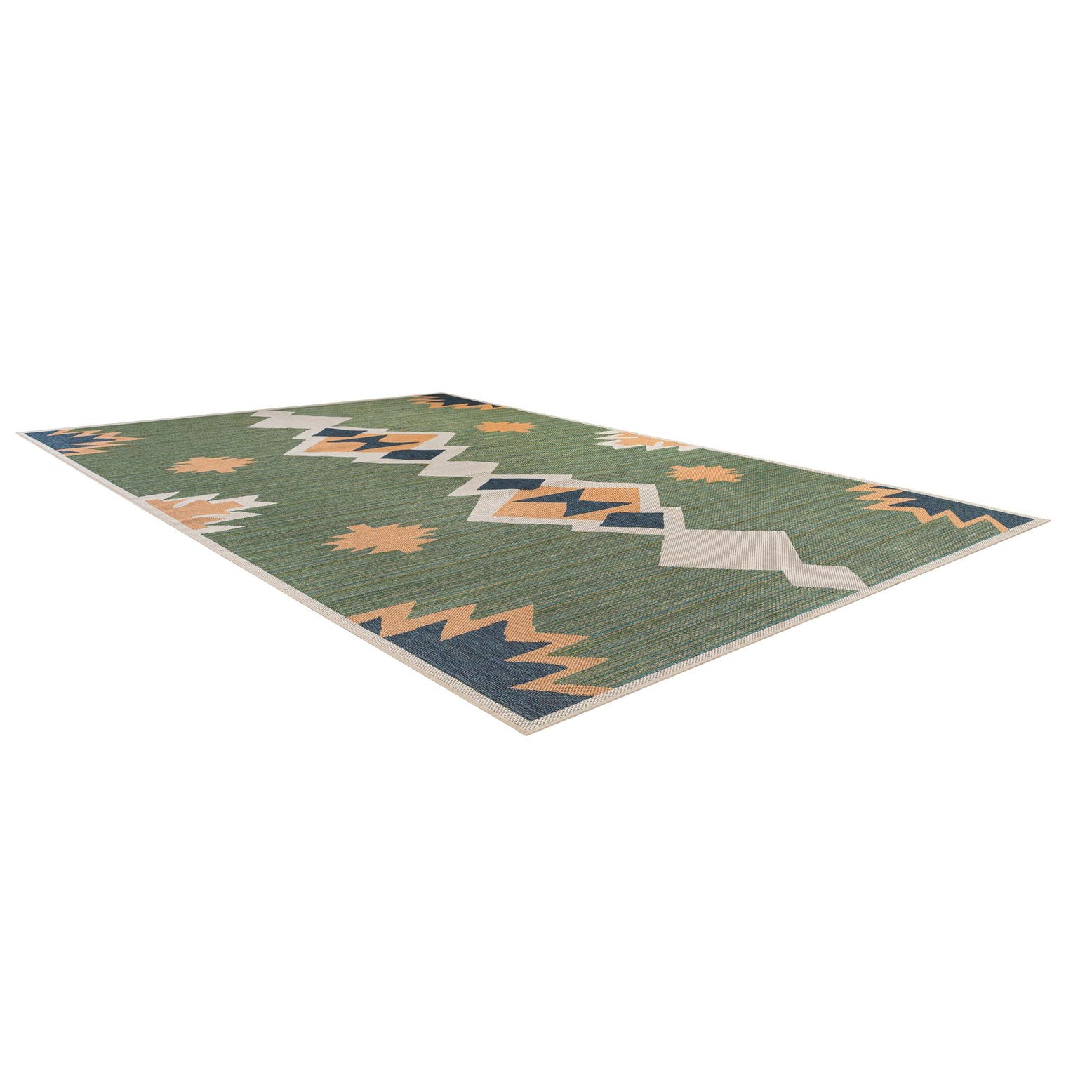 A 10x14 rectangular Baja Outdoor rug featuring a green background with a central column of tribal diamonds in beige, rust, and navy, flanked by rust and navy zigzag patterns.