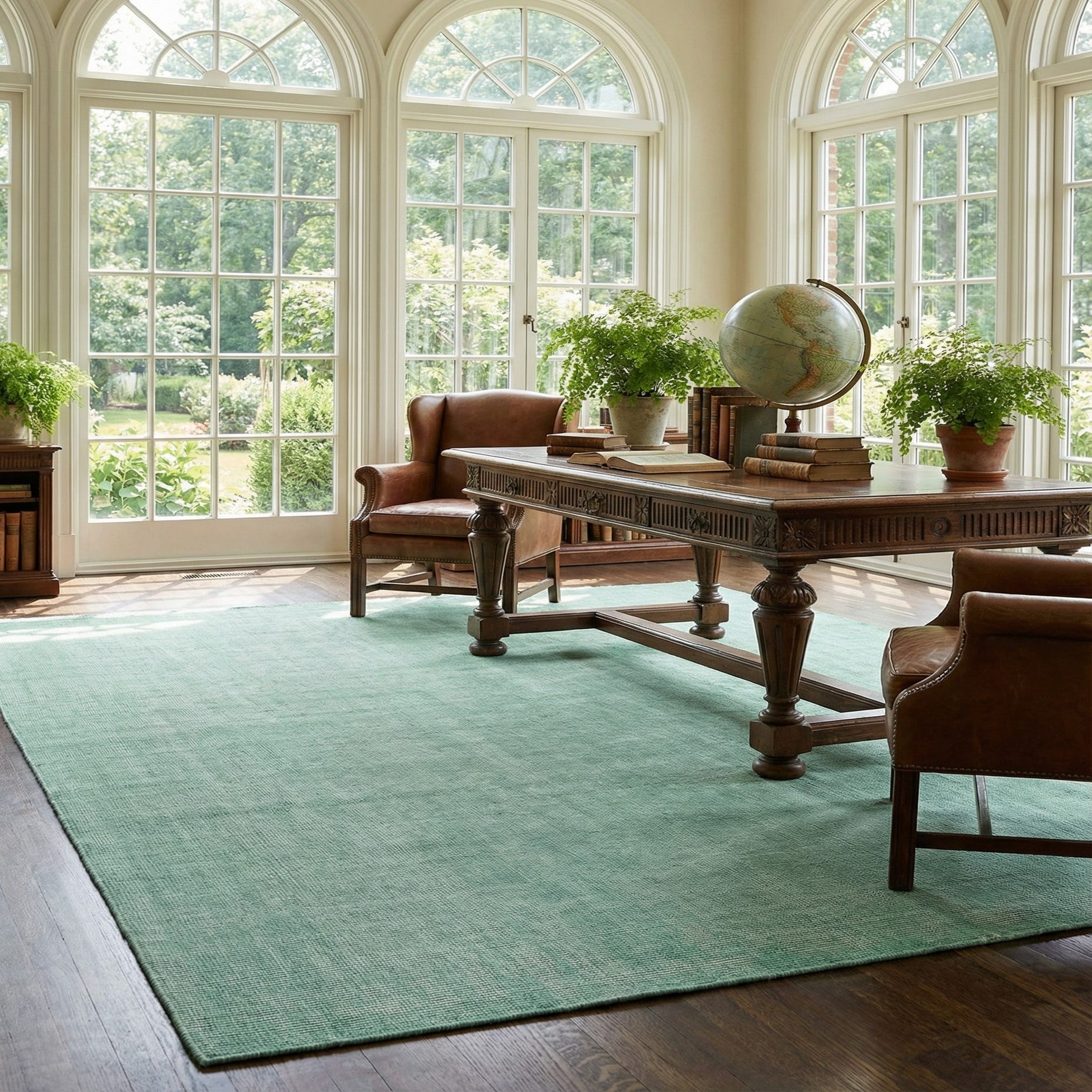 The rug’s restrained, transitional look works well in a range of interiors. It pairs naturally with light wood furniture and neutral upholstery for a relaxed living room, anchors a dining area without competing with table settings, and layers easily in a bedroom to complement ivory linens and muted accents. Its green background brings a quiet, natural tone that suits coastal, cottage, and contemporary farmhouse schemes alike.