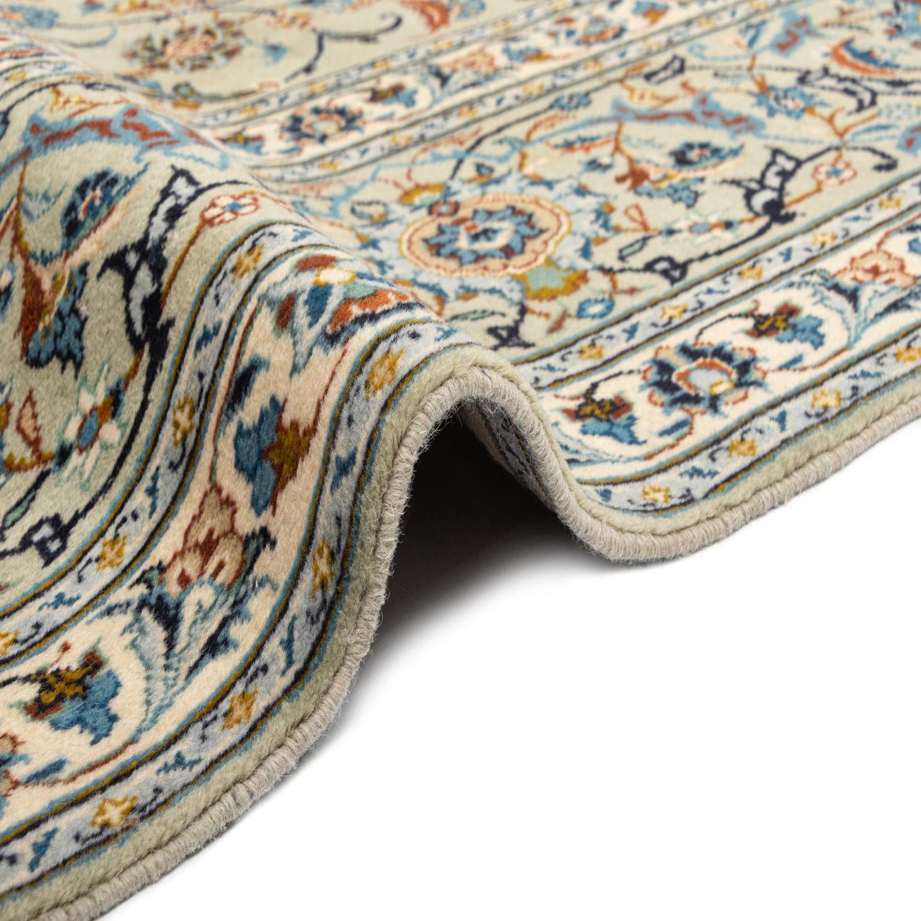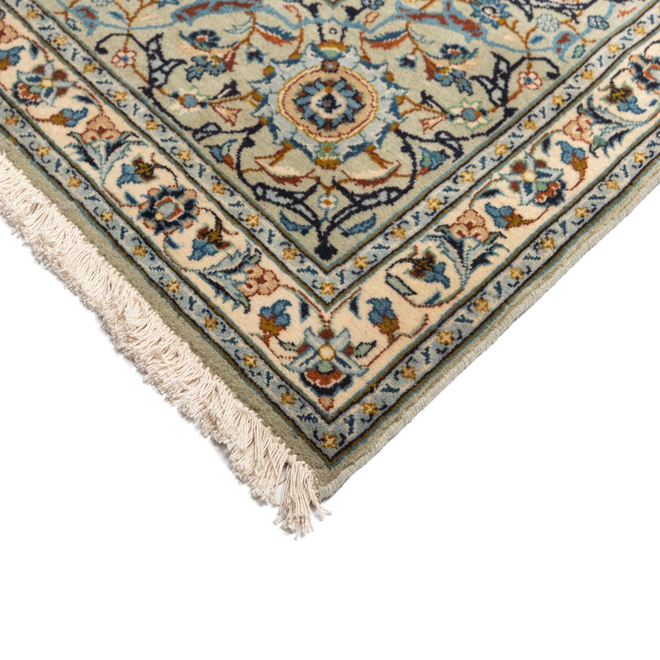This Kashan collection rug is handcrafted from 100% wool, offering a natural texture that is both durable and soft underfoot. The sizeable 10x14 dimensions make it a statement piece suitable for larger rooms. The rug features a classic design with a green background, adorned with intricate patterns that incorporate pistachio, cream, multiple shades of blue, brown, beige, and yellow accents.