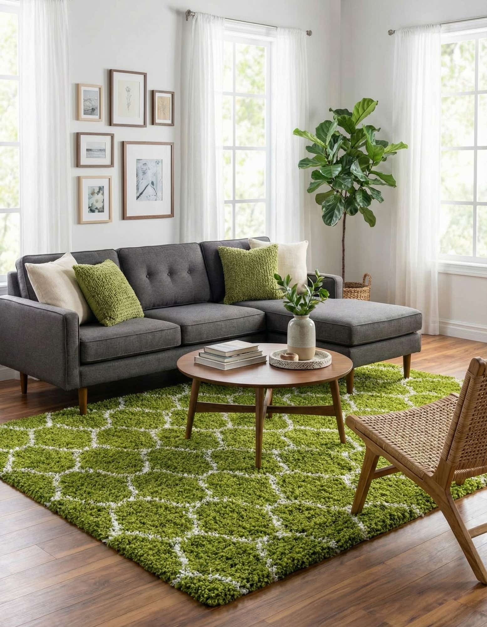 A 10x14 rectangular green shag rug with a white modern lattice pattern, featuring a textured high-low pile.