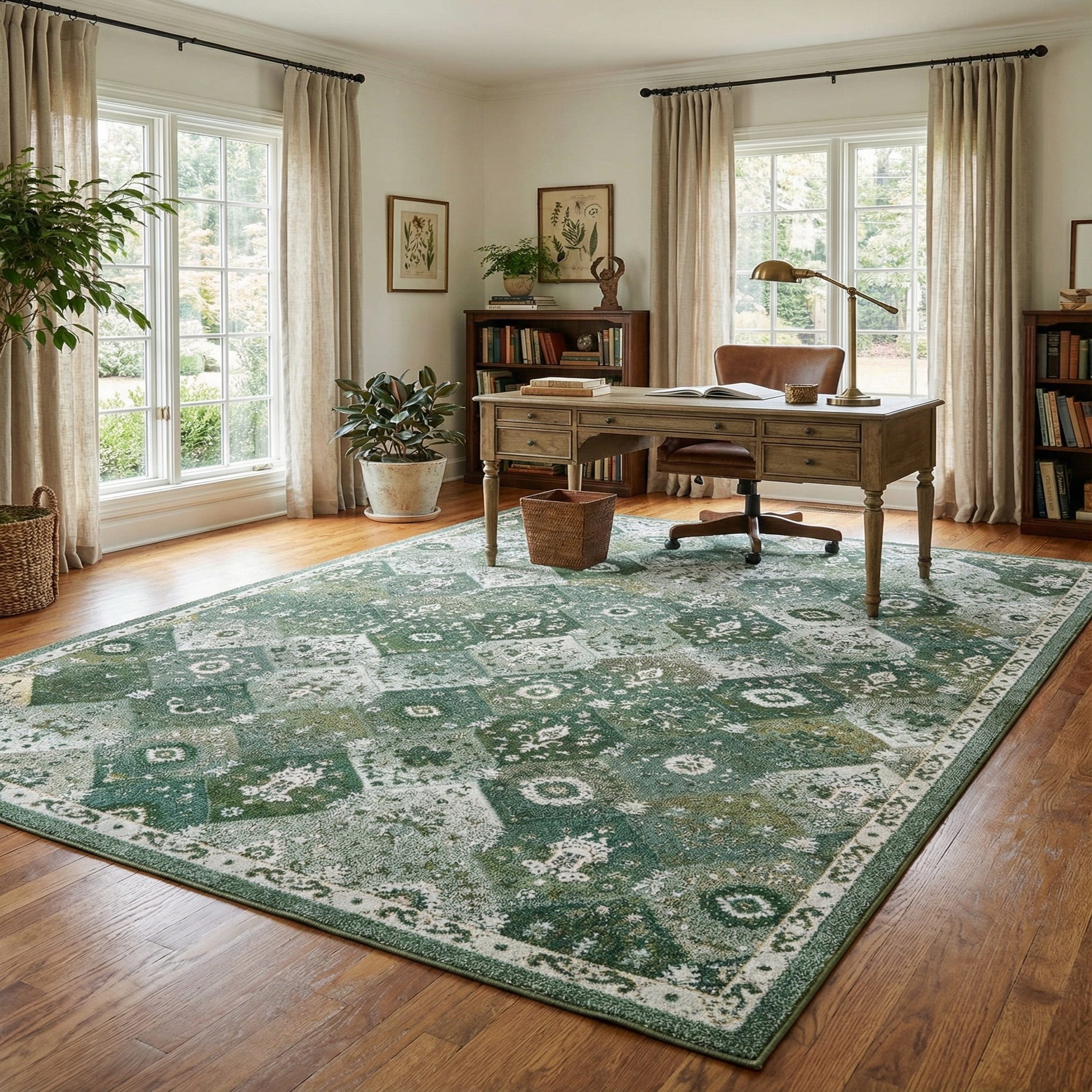Primary color is Green. Colors in this rug include: Green, Beige, Blue, Ivory.