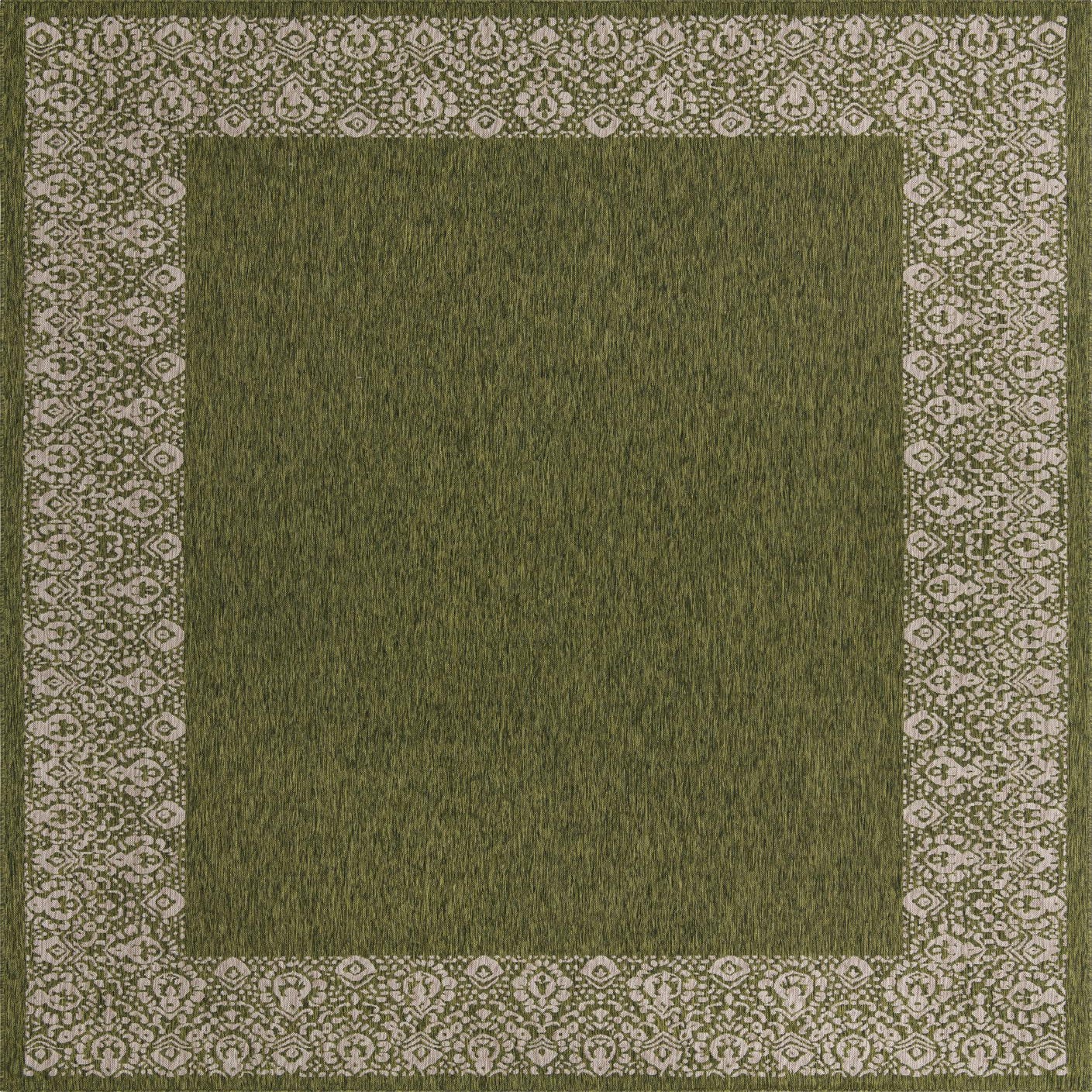 A 10x14 rectangular green indoor/outdoor rug with a light beige modern floral border, suitable for a patio.