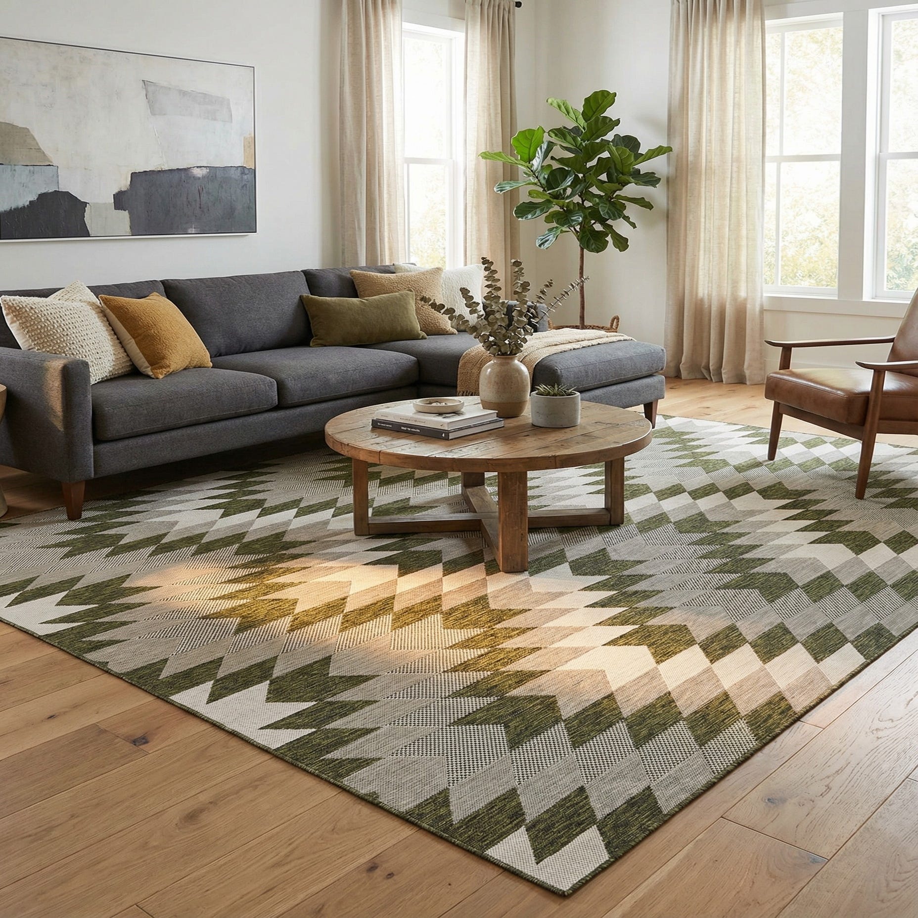 This rug anchors larger seating groups, defines an outdoor dining area, or brings a modern edge to a sunroom or covered patio. Pair it with warm wood furnishings and neutral linens to soften the green field, or combine it with rattan and brass accents for a relaxed, contemporary outdoor living look. Its clean geometry complements mid-century modern, minimalist, and coastal-inspired interiors.