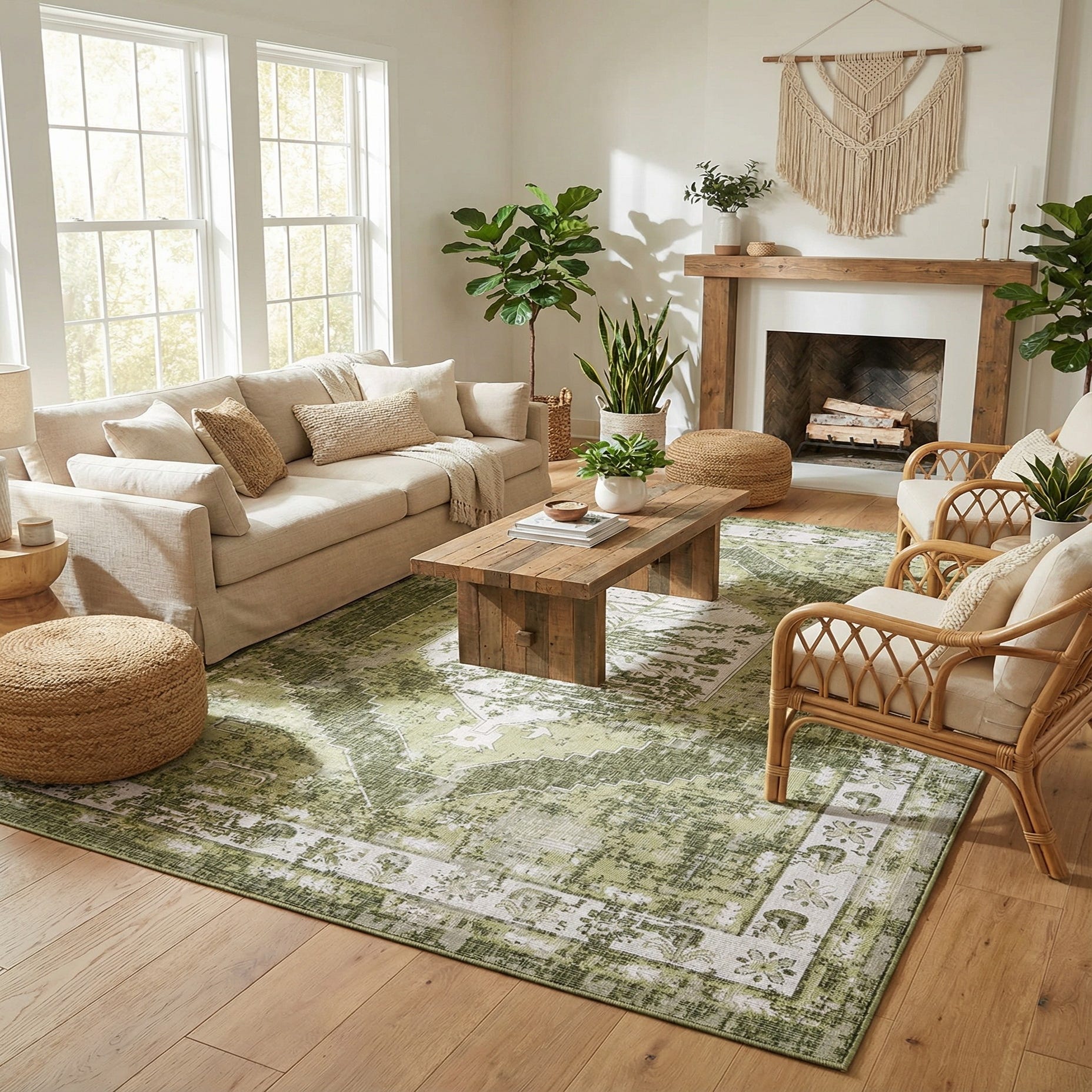 Underfoot the rug has a low-profile, tightly woven construction that feels firm with a slight texture from the polypropylene weave. That texture gives the piece enough presence to anchor a seating group without overwhelming lighter furnishings. It works well on a covered patio or sunroom beneath a dining set, under a compact living-room seating arrangement, or layered with a neutral sisal in a transitional or cottage-style interior. Pair it with wicker or light-stained wood furniture, ivory linens, and plenty of plants for a relaxed, collected feel; it also complements traditional or farmhouse palettes when combined with warm wood tones and simple metal accents.