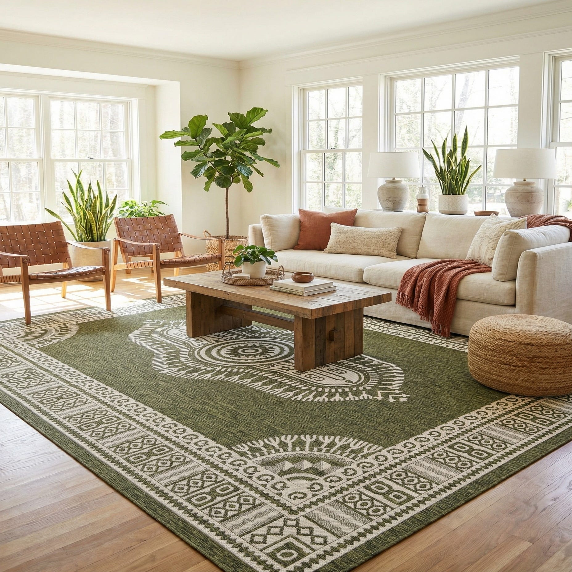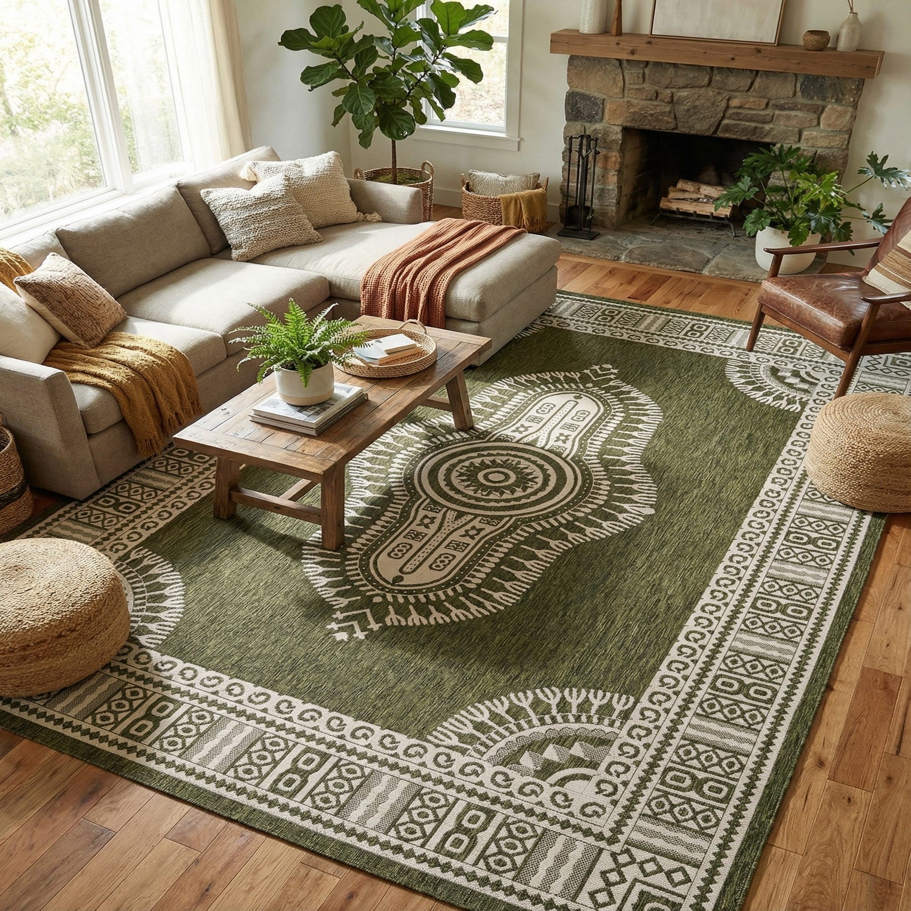 Machine-made from 100% polypropylene, the rug has a low-profile, tightly woven surface that feels firm underfoot with a subtle texture where the design rises from the ground. Its construction suits high-traffic and covered outdoor areas as well as indoor rooms that need a durable, easygoing foundation. Style pairings include a covered patio with rattan seating and linen cushions, a sunroom layered with natural wood and neutral textiles, or a living room with warm wood tones and ivory accents for a grounded, collected look.