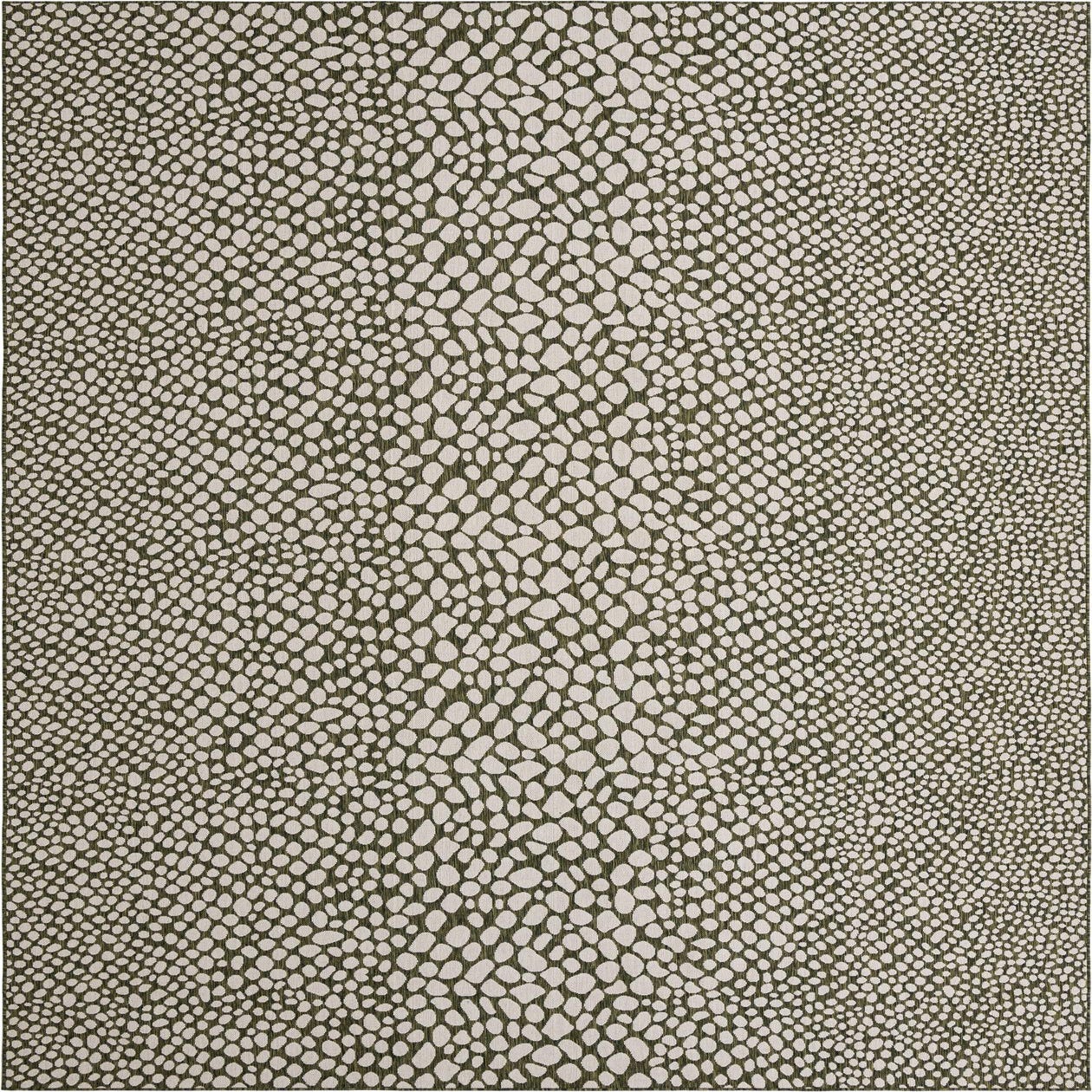 A 10x16 rectangular Jill Zarin Outdoor rug in shades of green with a modern, organic pebble-like pattern, suitable for a patio.