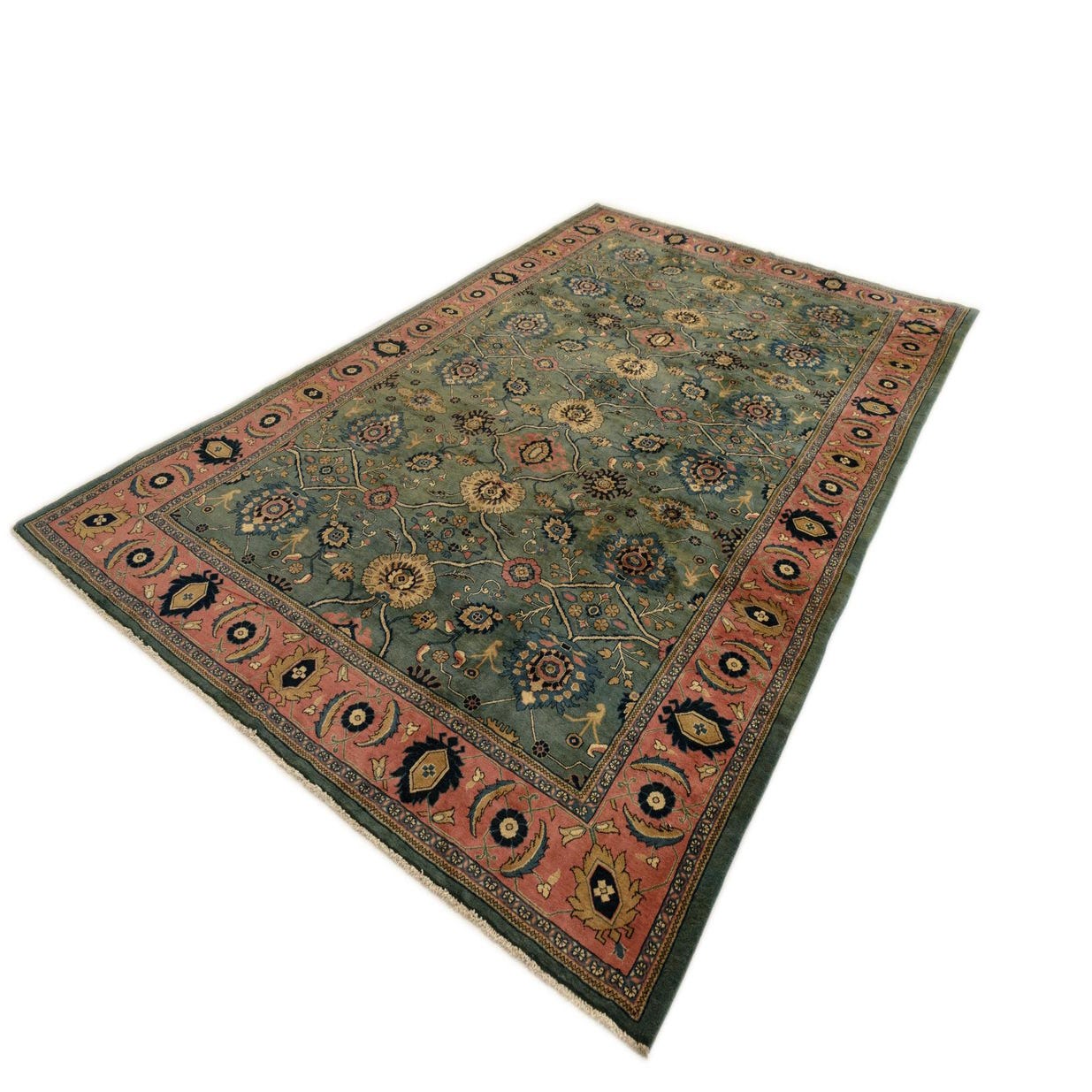 A large 10x16 rectangular green Persian wool rug with a detailed floral pattern and a coral-pink border.