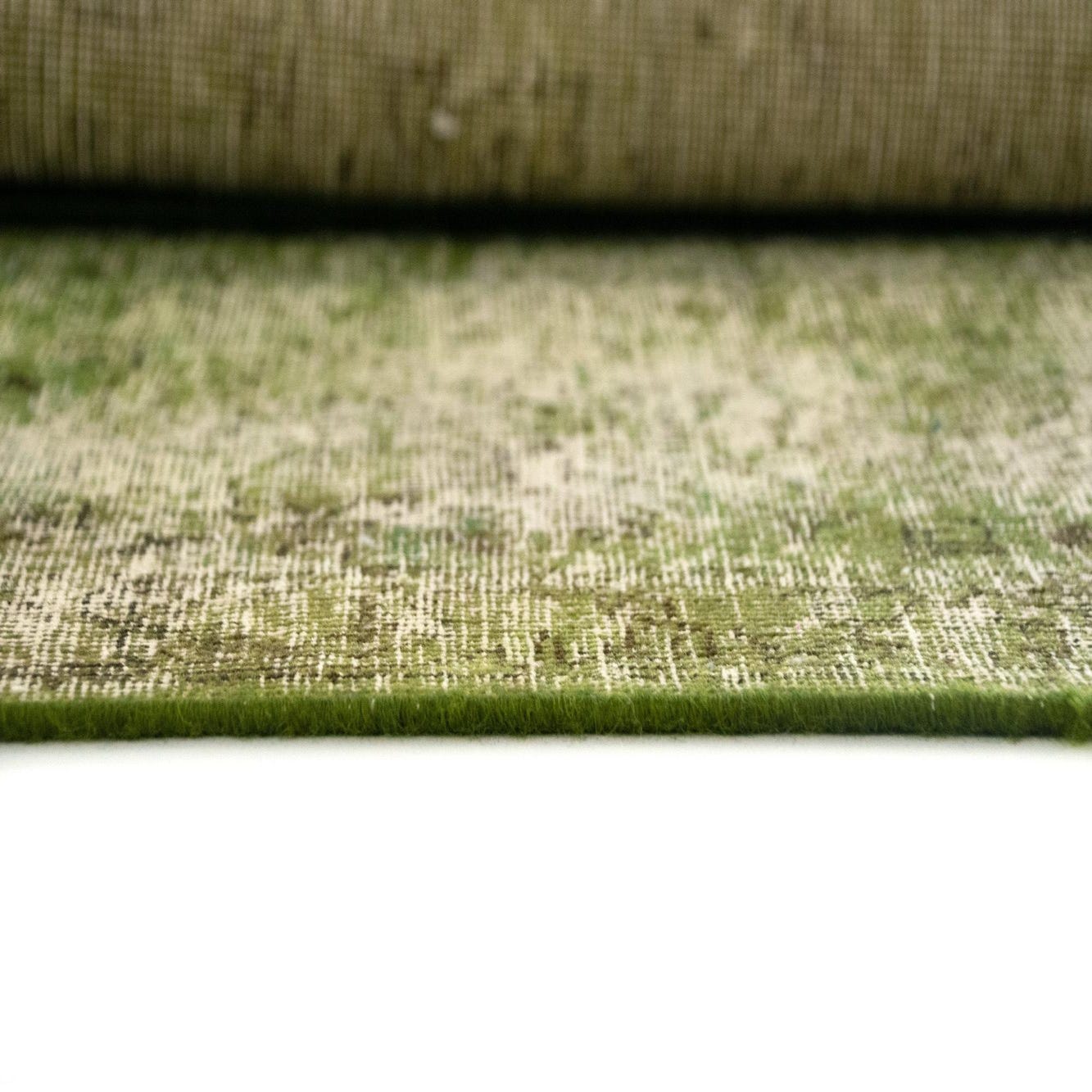 A large 10x16 rectangular green Persian wool rug with a distressed, vintage-style pattern, suitable for an indoor living space.