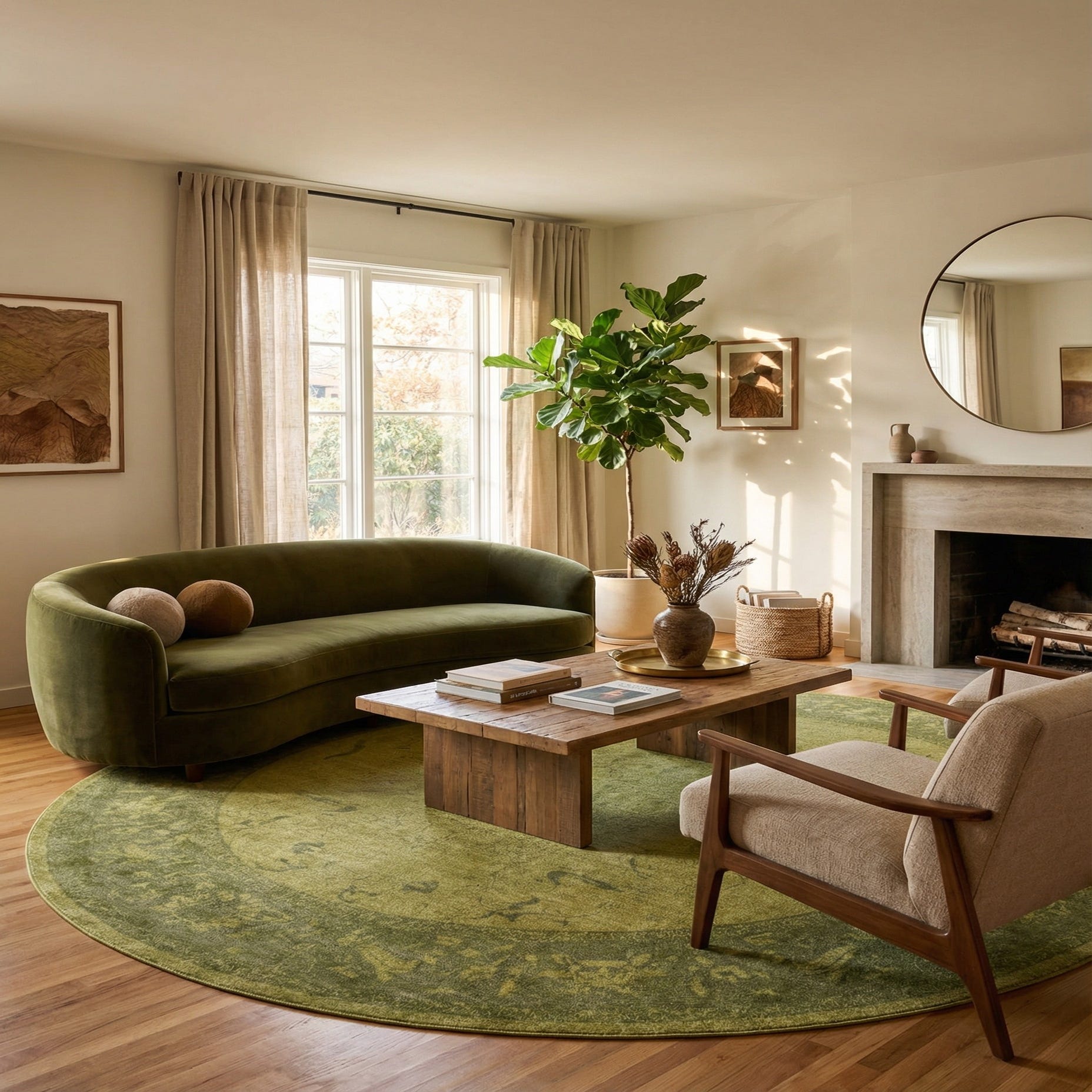 Thanks to its substantial size and round shape, this rug could serve as an anchor piece in spacious living areas or under large round dining tables. Its traditional pattern combined with the contemporary color treatment makes it versatile for integration into both classic and modern interior styles. Without a doubt, the rug would pair well with earthy tones and wooden furnishings, adding warmth and cohesion to the space.