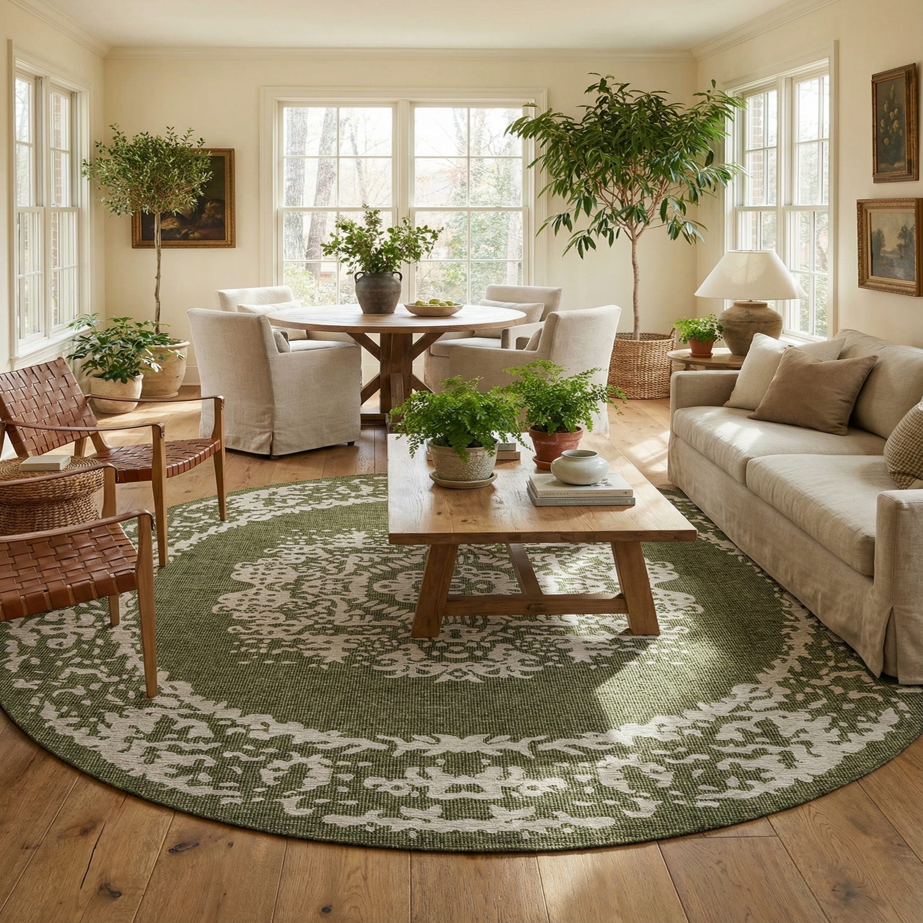 This round design suits covered outdoor rooms, sunrooms, or a casual dining area where you want pattern without heavy formality. Pair it with woven or painted wood furniture and neutral cushions to highlight the green and gray palette, or use it to add contrast beneath light-toned seating and potted greenery for an inviting, grounded look. It also complements traditional furnishings and transitional schemes that mix classic silhouettes with modern finishes.