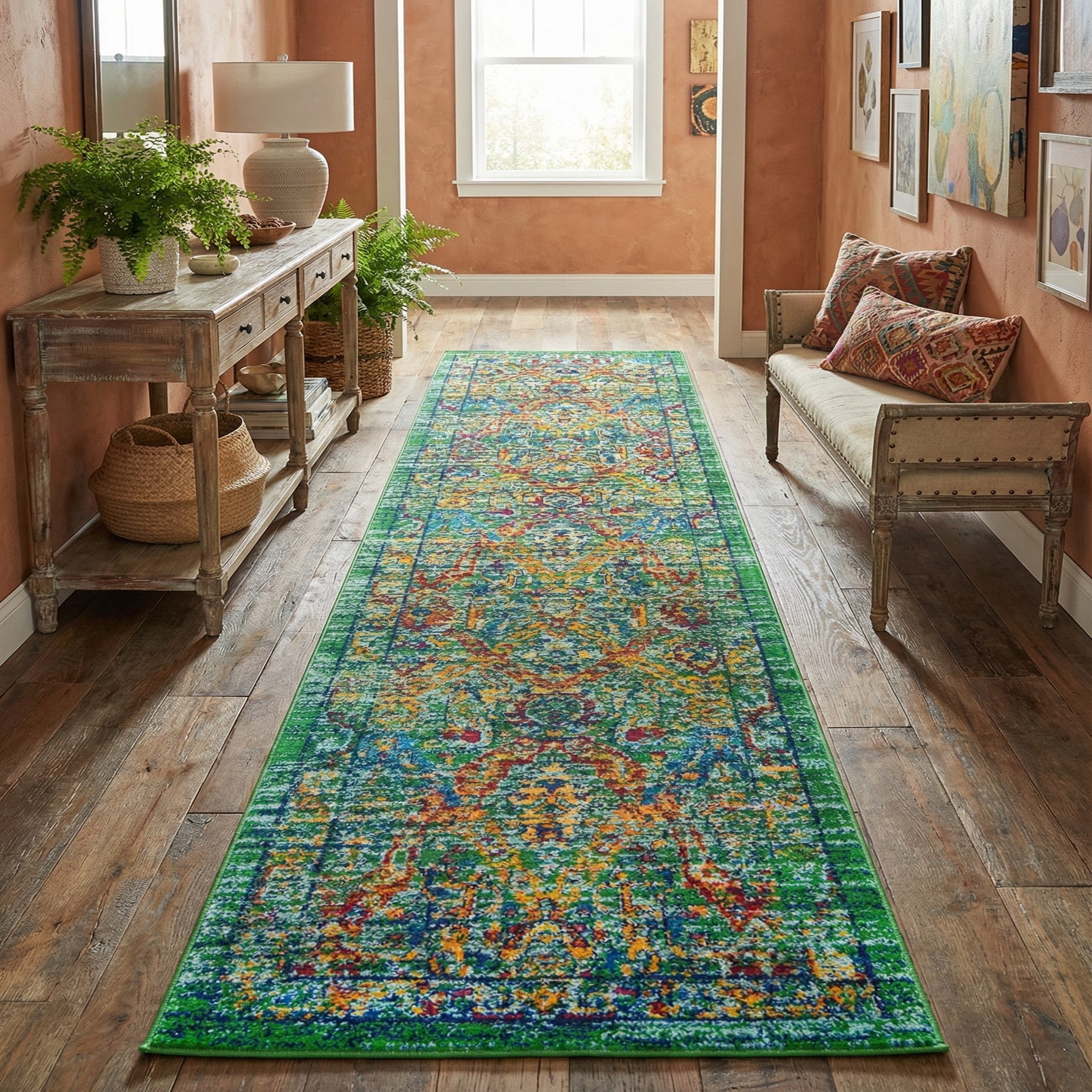 A lively green field sets the stage for a richly patterned runner that pairs traditional medallion motifs with a deliberately distressed, painterly finish. Layers of light blue, navy, red and orange thread through floral and arabesque forms, creating a balanced, multicolored surface that feels lively without overwhelming. Machine made from 100% polypropylene, the rug has a low, even pile that feels smooth underhand; the multicolor yarns create slight variation in texture where the design rises and falls, and a soft sheen catches light for subtle depth.