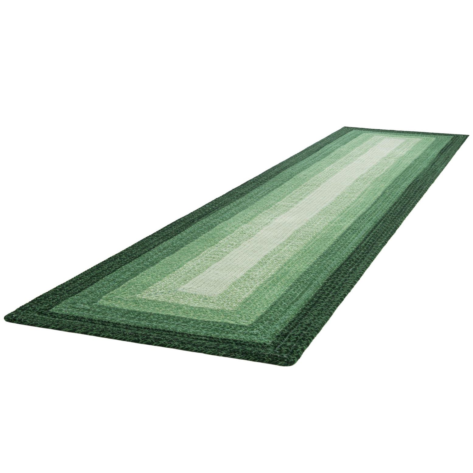 A 12 ft green runner rug with a braided texture, featuring a gradient of light to dark green shades.
