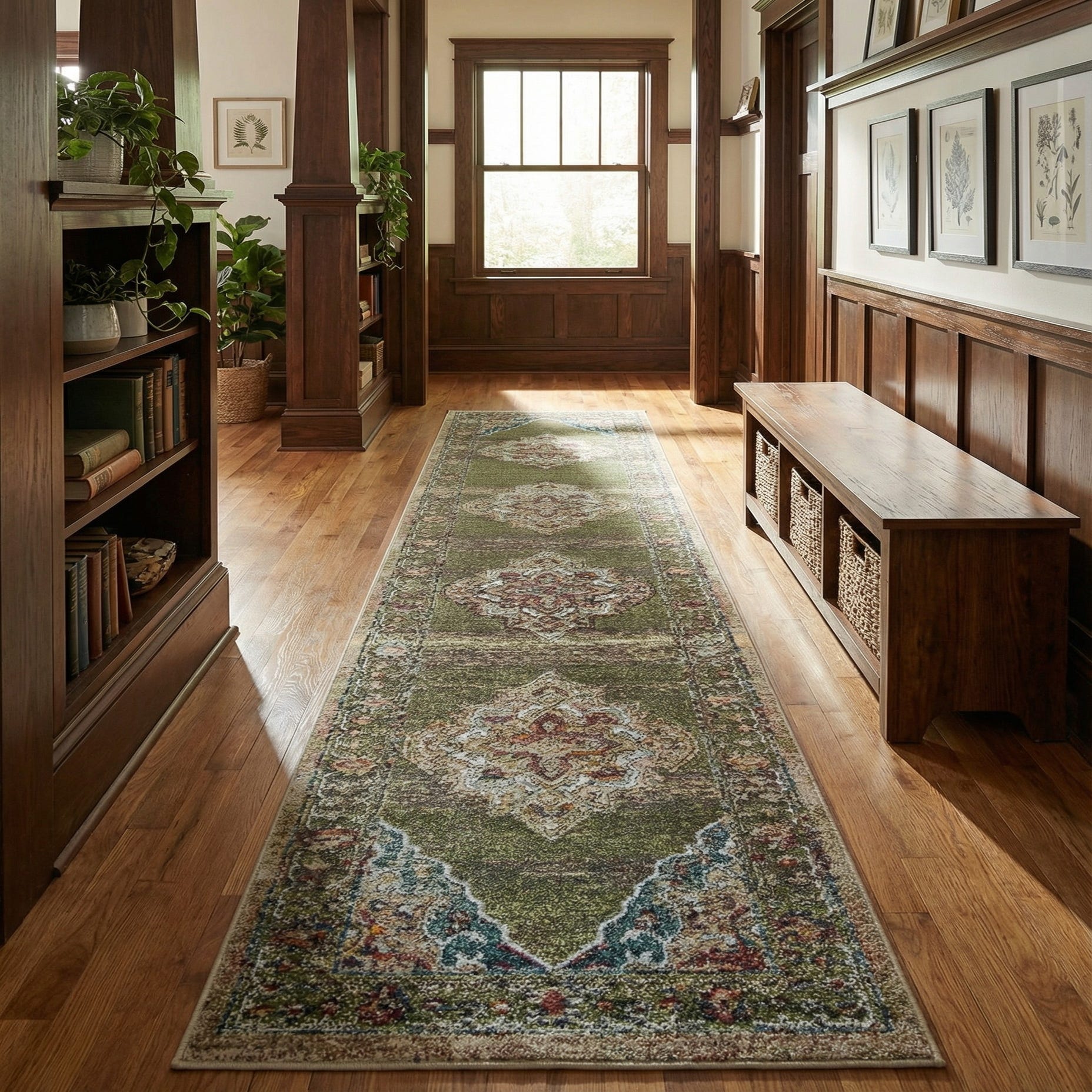 This runner works well in narrow spaces where you want visual interest without overwhelming the room: place it in a hallway or entry framed by warm wood floors and a simple console, or use it in a kitchen aisle to add color and pattern between cabinets. It also complements traditional and transitional schemes as well as eclectic or cottage-inspired interiors—pair it with olive or navy upholstery, brass or matte black metal accents, and layered textiles for a pulled-together look.