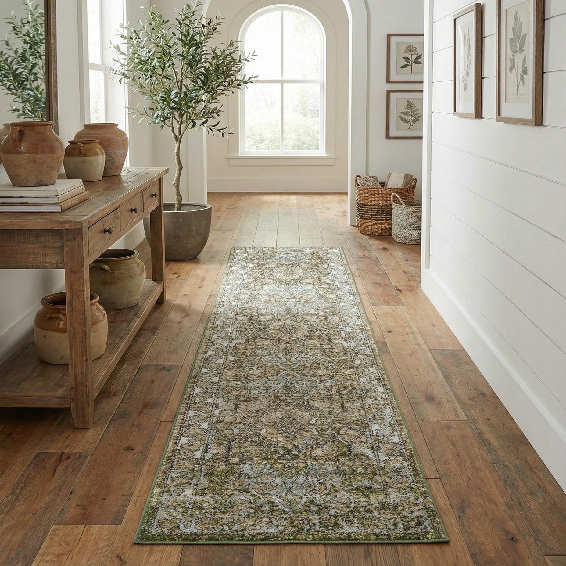 Place this runner down a long hallway or use it to define a narrow entryway; it also layers nicely in front of kitchen islands or along the side of a bed. The green background pairs well with warm wood floors, painted millwork in muted tones, and blue or gray upholstery, fitting transitional, modern farmhouse, or eclectic interiors where a subtle, lived-in look is desired.