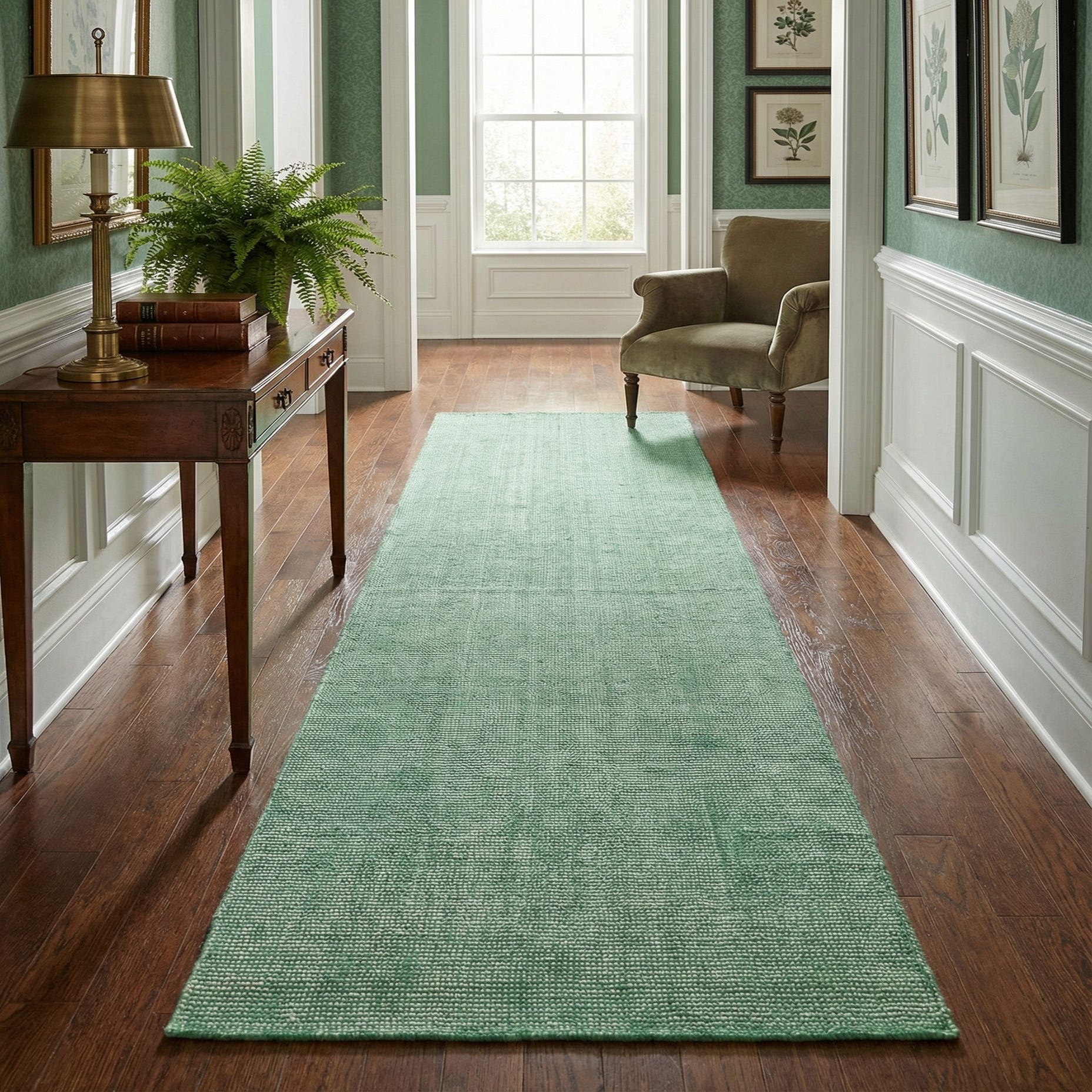 Hand woven of 100% wool, this runner presents a clean, understated backdrop in a soft green hue. The tight, low-profile weave creates a subtle heathered effect—lighter yarns woven through the field produce a gentle salt-and-pepper appearance and fine linear texture. The surface is soft underfoot with a tactile, structured feel that adds visual depth without a defined motif.