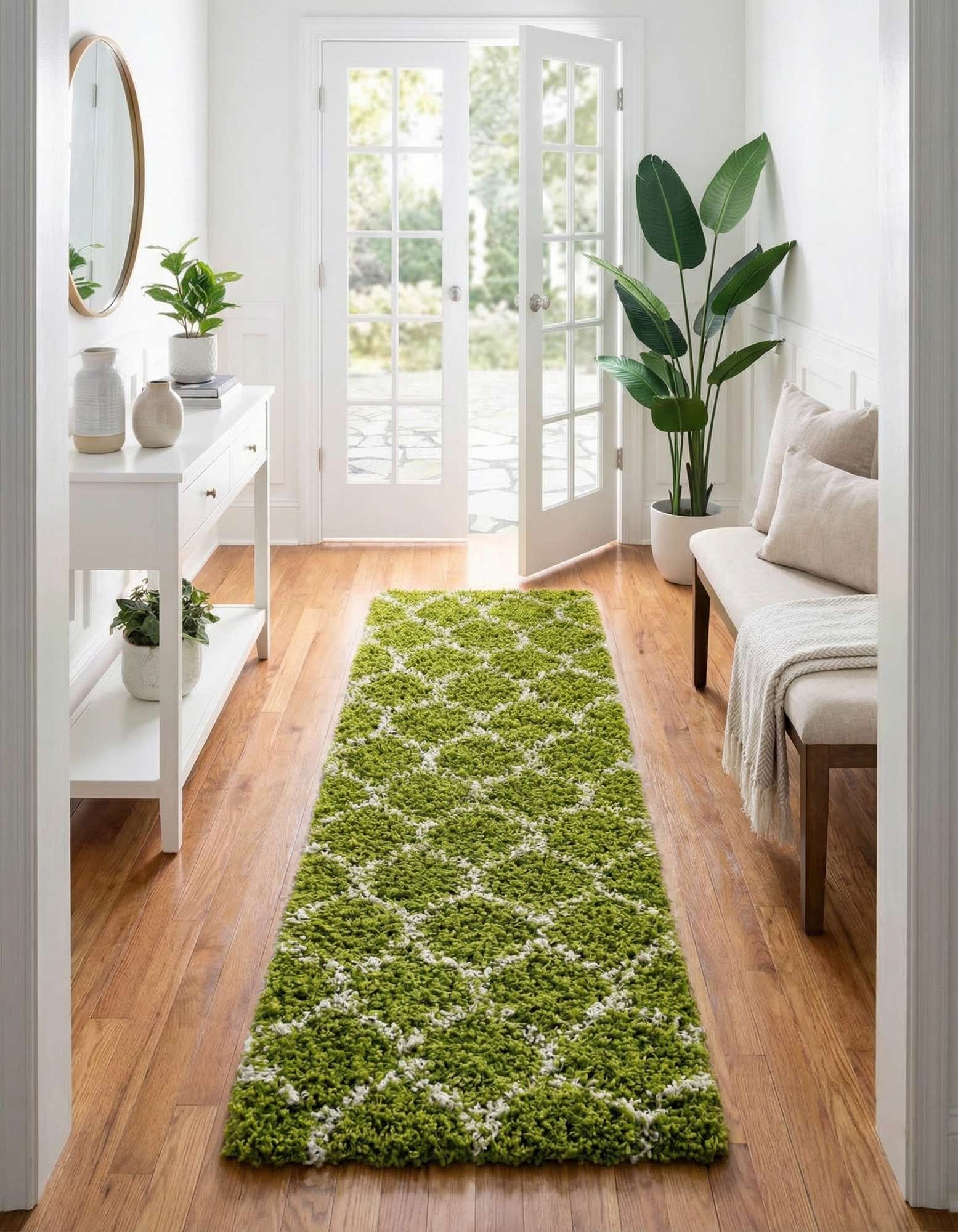 A bold green field set against a crisp ivory lattice creates a repeating diamond motif that reads both modern and approachable. The shag construction combines higher, plush tufts with lower, textured strands for a tactile, dimensional surface you can feel underfoot. Machine-made from 100% polypropylene, the runner holds its shape while offering a soft, cushiony pile that complements narrow spaces.