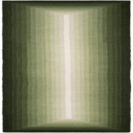 A 12 ft runner rug featuring a modern ombre pattern transitioning from dark green to light green and white in the center.