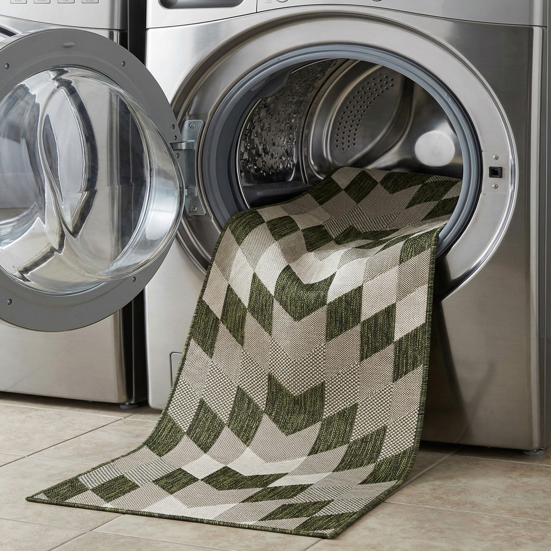 This runner works well down a covered porch or sunroom aisle, as an entry hall anchor, or along a kitchen or mudroom corridor where you want clean lines and easy maintenance. Pair it with light-washed wood, black metal accents, or woven rattan for a contemporary or Scandinavian look; it also complements coastal and modern farmhouse schemes. The green background brings a natural, grounded note that plays nicely with plants, linen textiles, and warm wood tones.