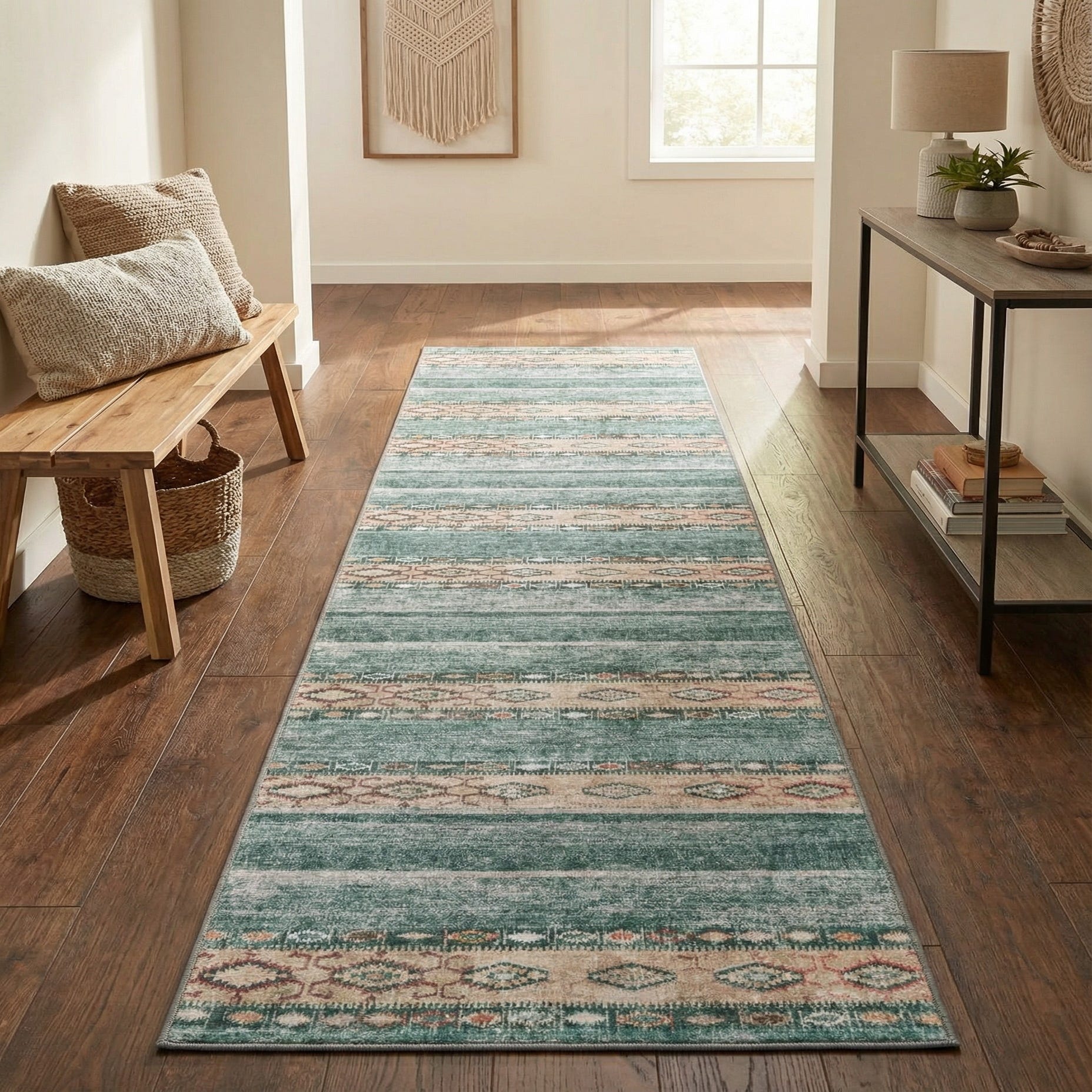 Use this runner to add color and pattern to a hallway, entry, or alongside a kitchen island. It pairs well with light to medium wood floors and neutral upholstery, and it complements transitional, modern farmhouse, or relaxed coastal interiors where a muted, aged look is desired. Layer it under a narrow console or runner bench to anchor an entry vignette or use it to guide traffic through a longer corridor while keeping the palette calm and cohesive.
