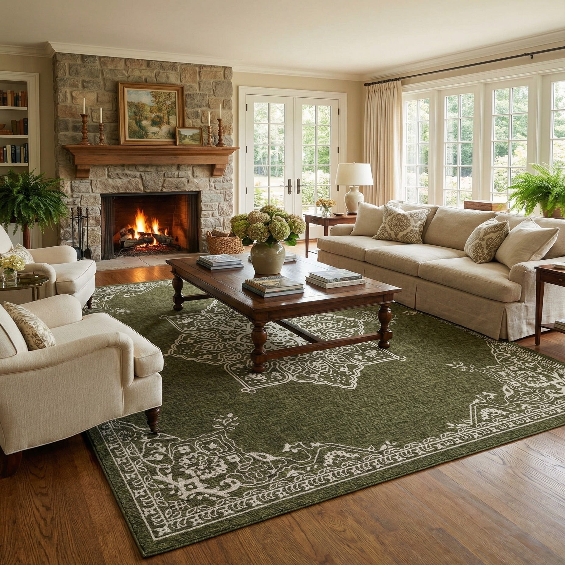 A 12' square green indoor/outdoor rug with a white traditional medallion pattern and border, suitable for a patio.