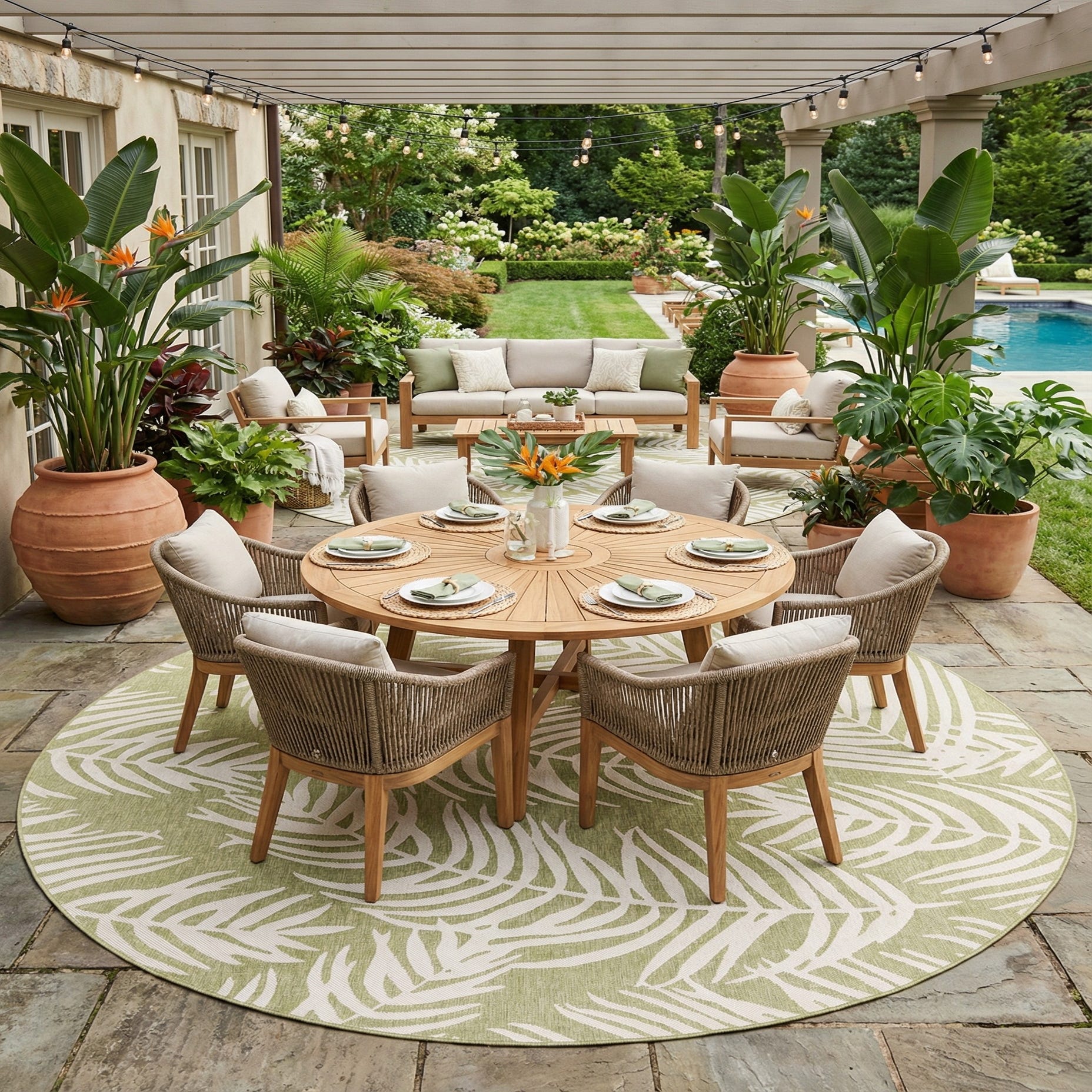 A large round green and white tropical rug featuring a bold palm leaf pattern, ideal for a patio.