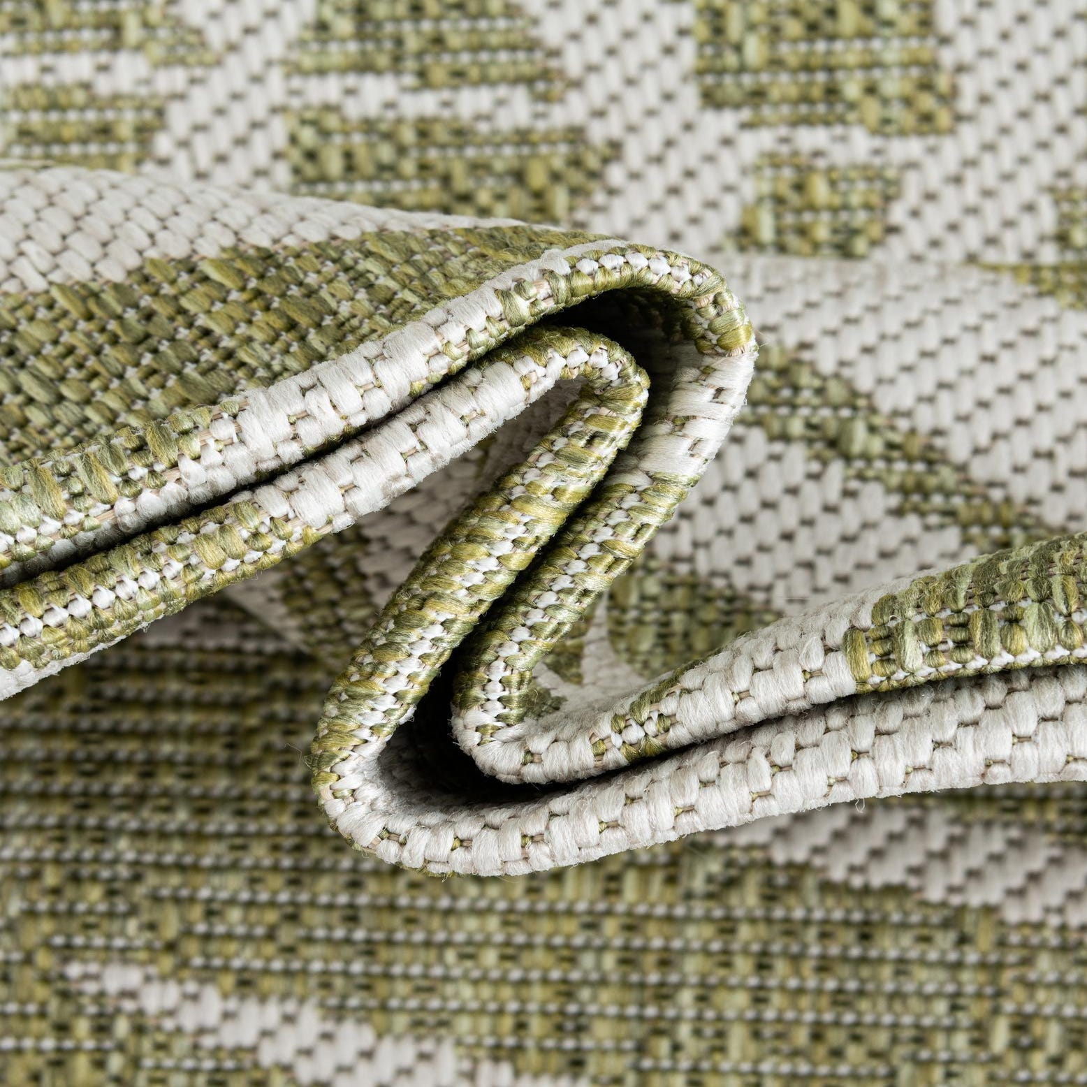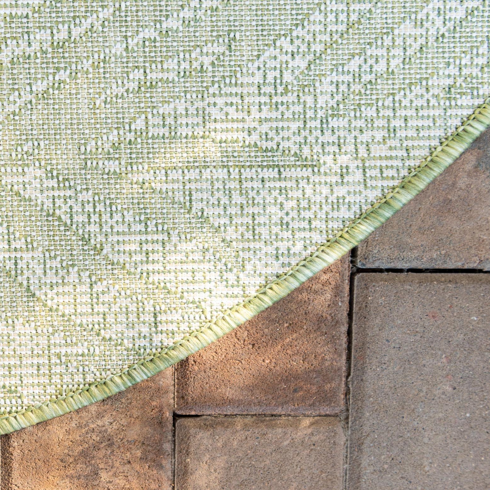Machine made of 100% polypropylene, this round outdoor rug is well-suited to patios, covered porches, sunrooms, or poolside seating areas. Use it to anchor a circular dining set, define a lounge area with teak or wicker furniture, or add a fresh, natural touch to a coastal or modern tropical scheme with neutral cushions and rattan planters.