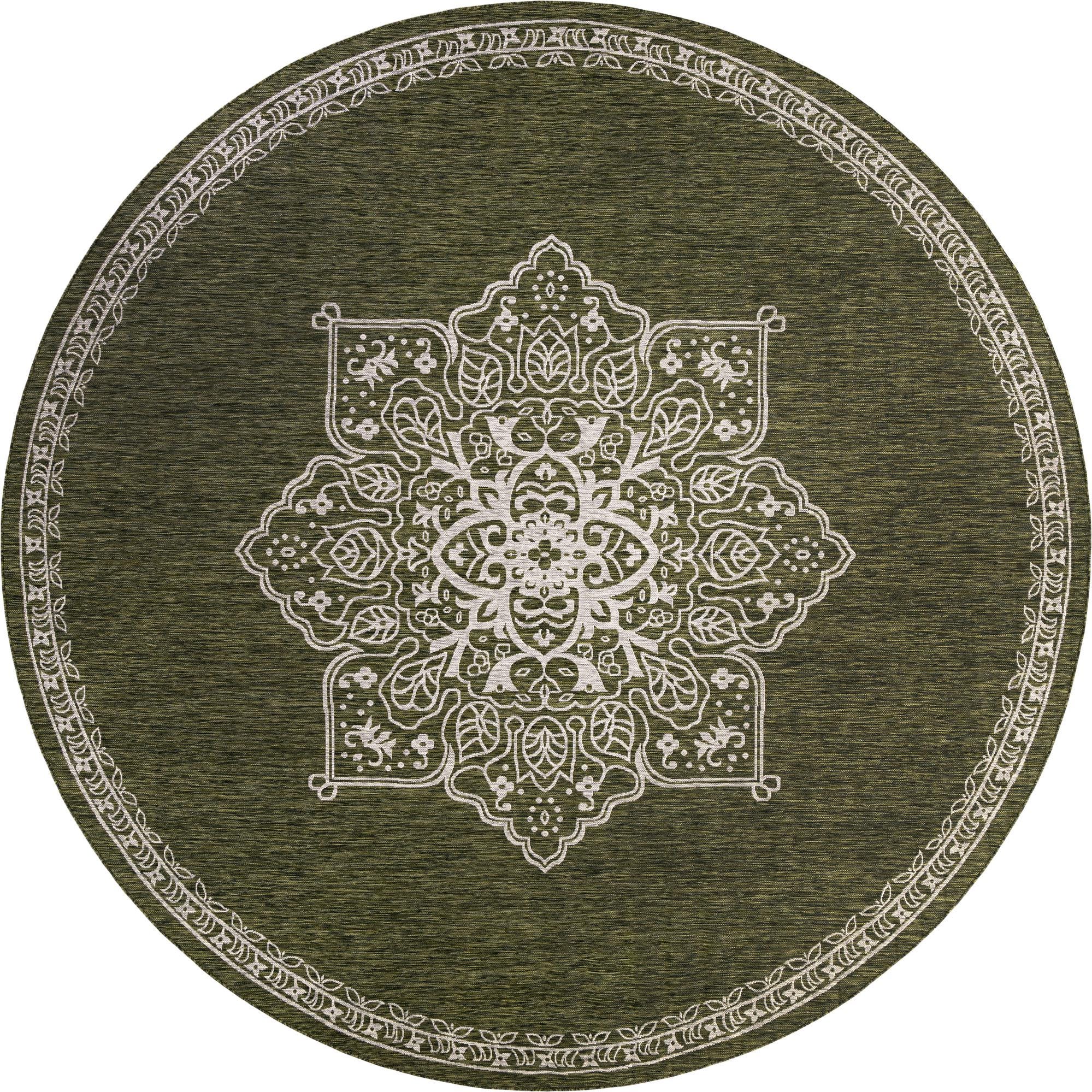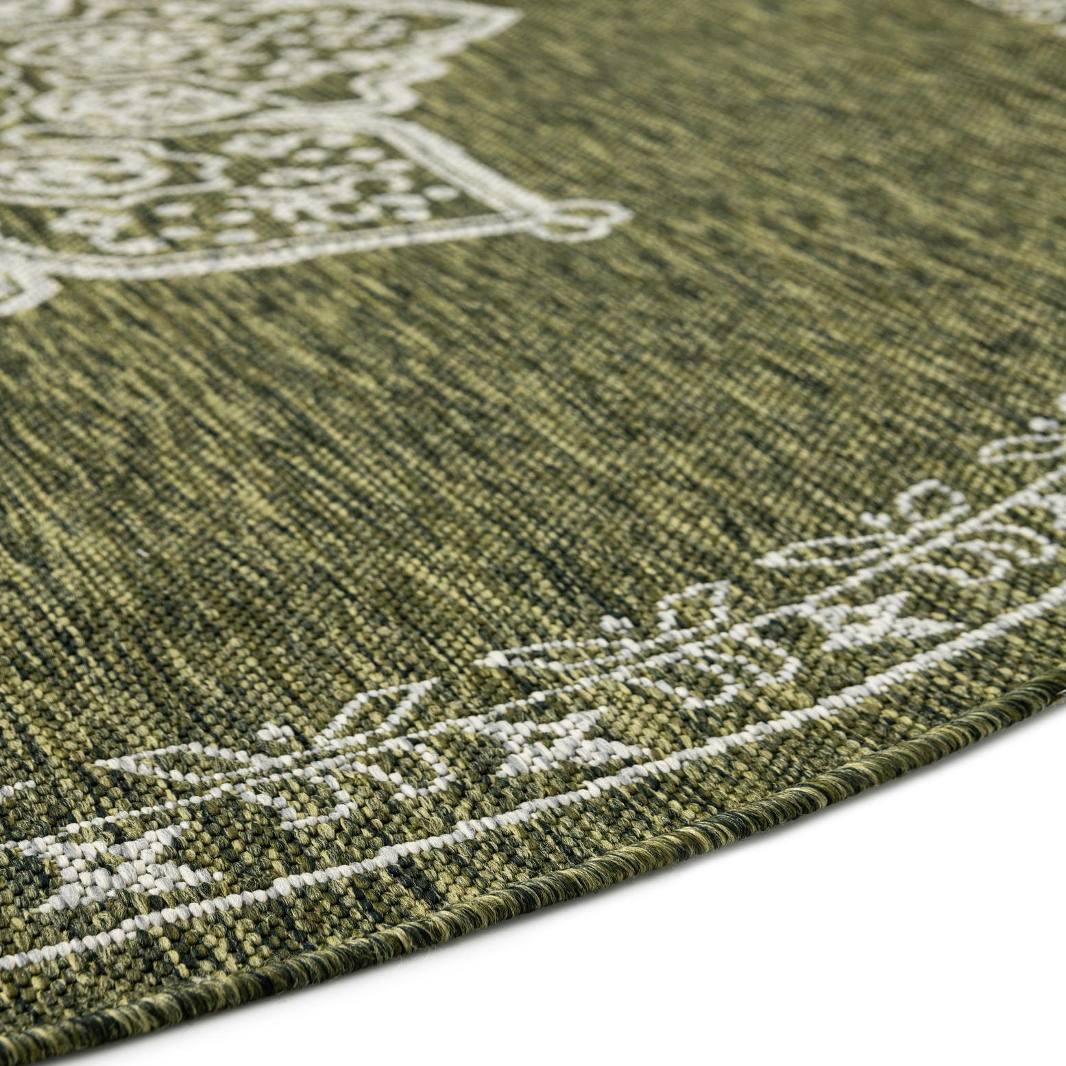 A 13-foot round green indoor/outdoor rug with a white traditional medallion pattern and border.