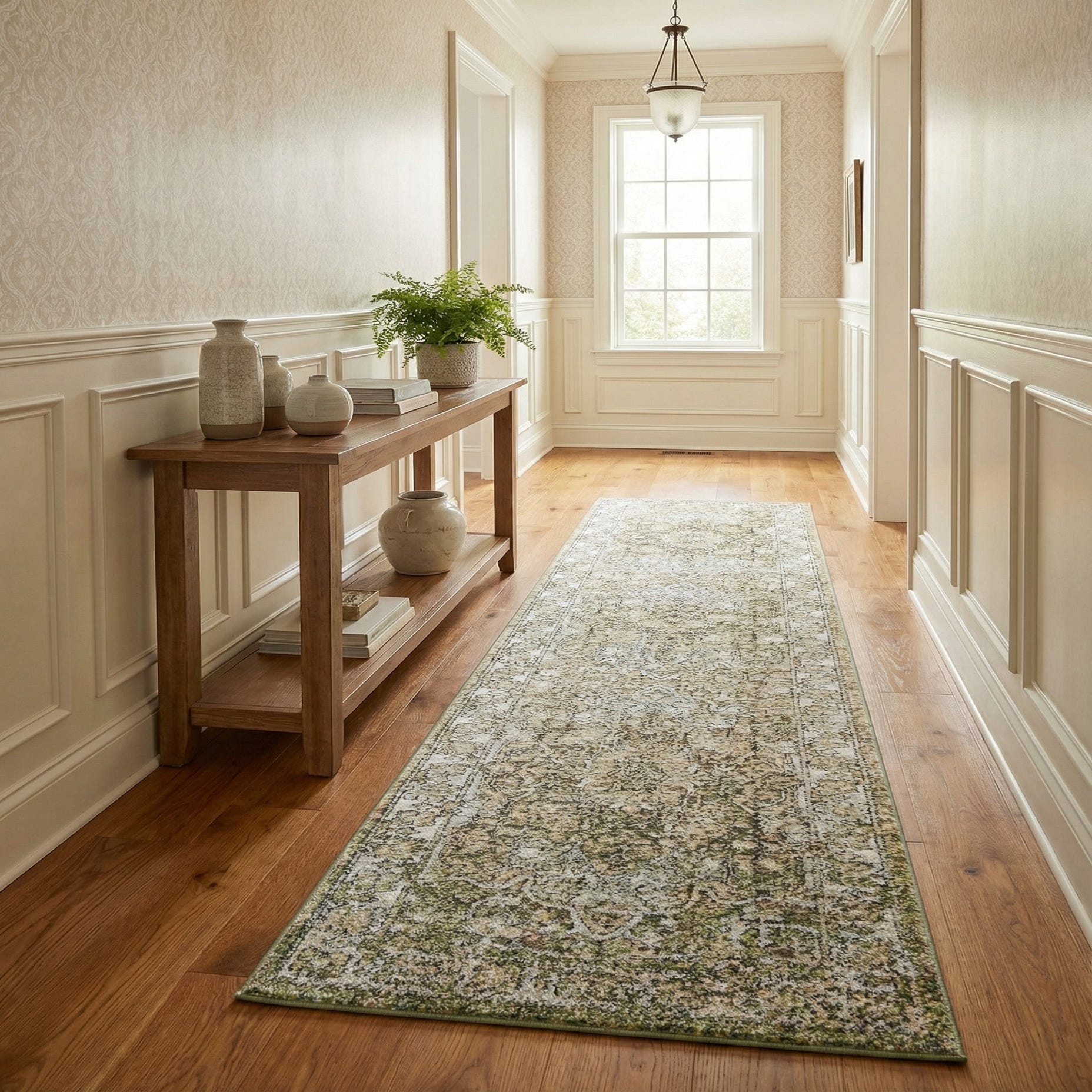 Primary color is Green. Colors in this rug include: Green, Black, Blue, Gray, Ivory.