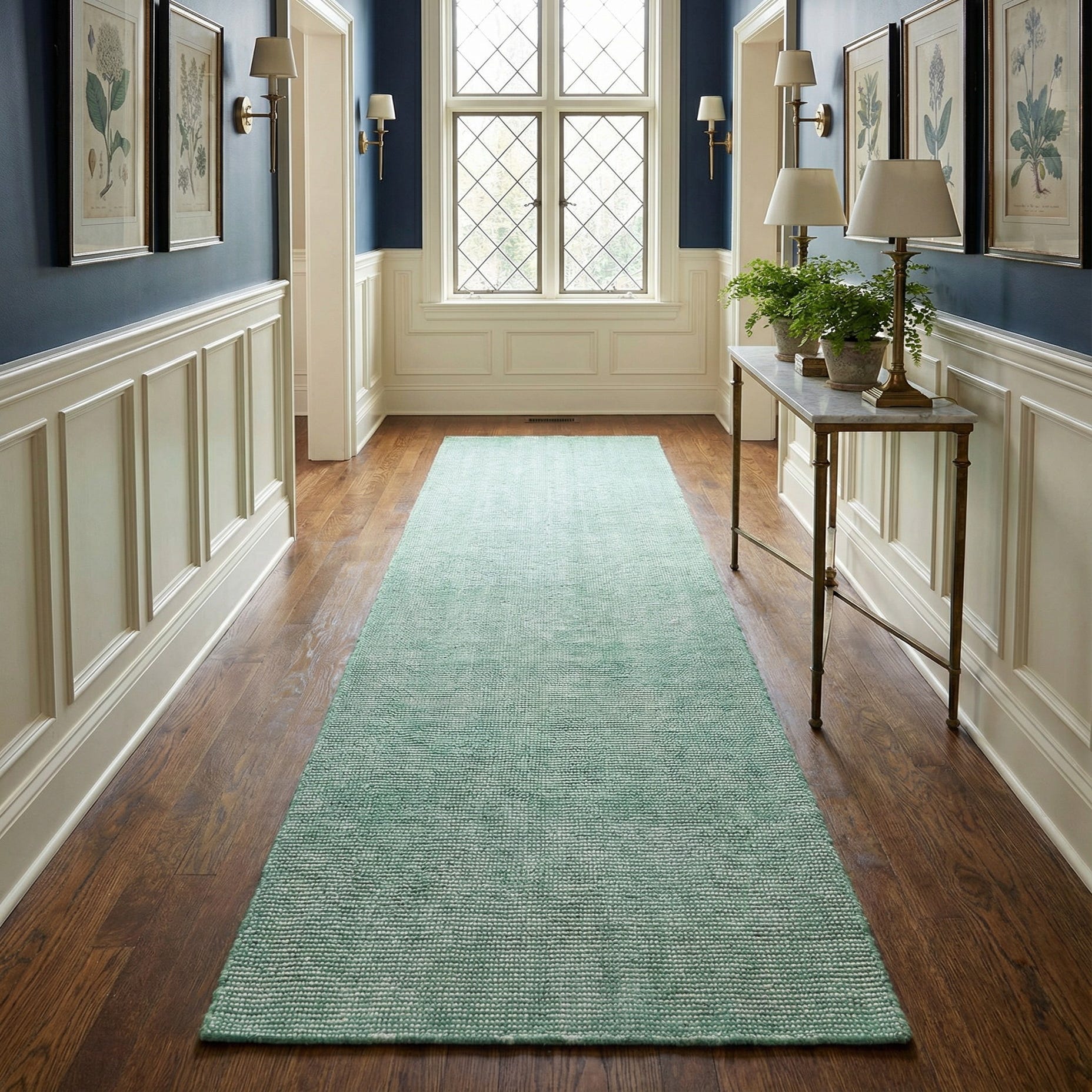 The rug’s understated, transitional style works well in hallways, entryways, kitchens, or alongside a bed to introduce color and texture without dominating the room. Pair it with light wood flooring and neutral upholstery for a fresh, relaxed look, or combine it with painted cabinetry and matte hardware in coastal, cottage, or modern-traditional interiors for a composed, layered finish.