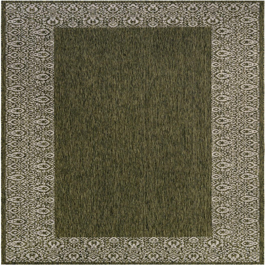 A 13 ft green runner rug with a light-colored, intricate vintage-style border, suitable for hallways or patios.