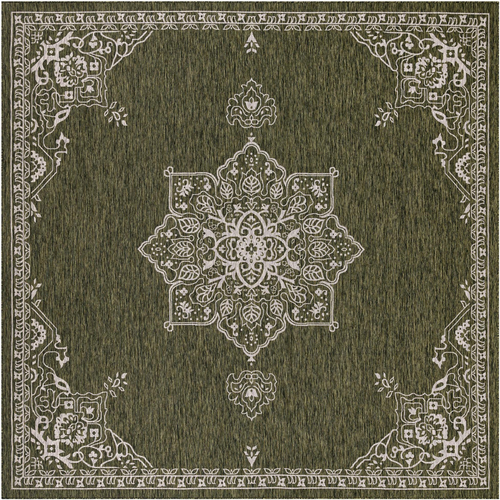 A 13' square green indoor/outdoor rug with a white traditional medallion pattern and border.