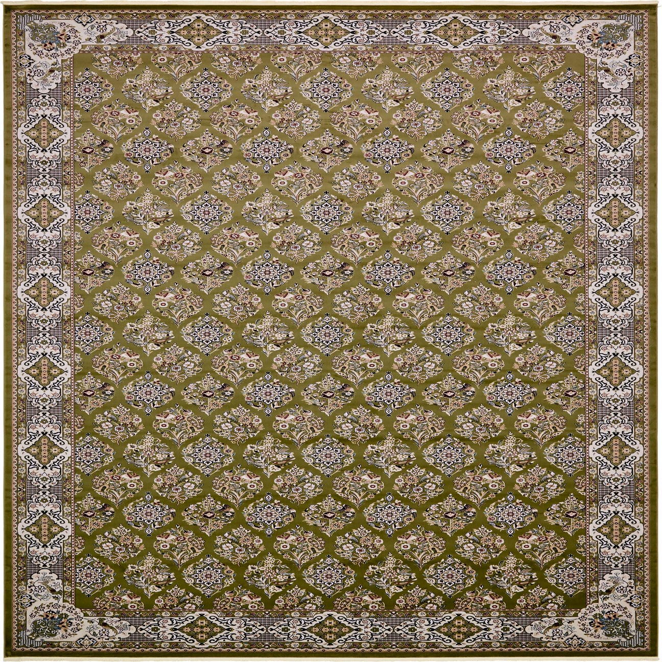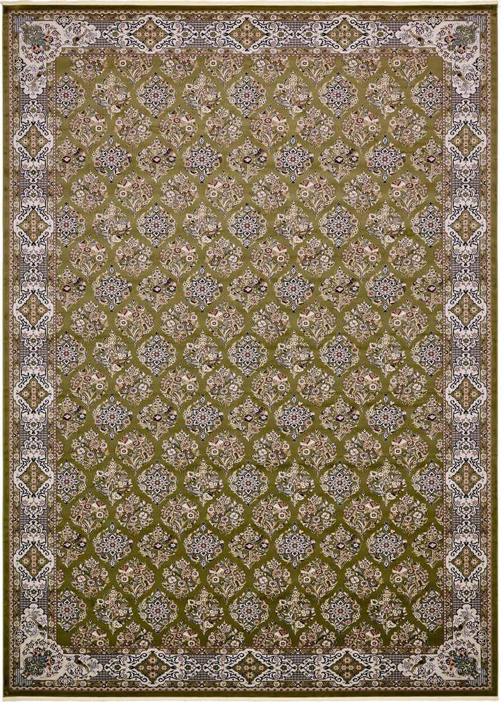 Primary color is Green. Colors in this rug include: Green, Beige, Blue, Burgundy, Cream, Ivory, Navy Blue, Puce.