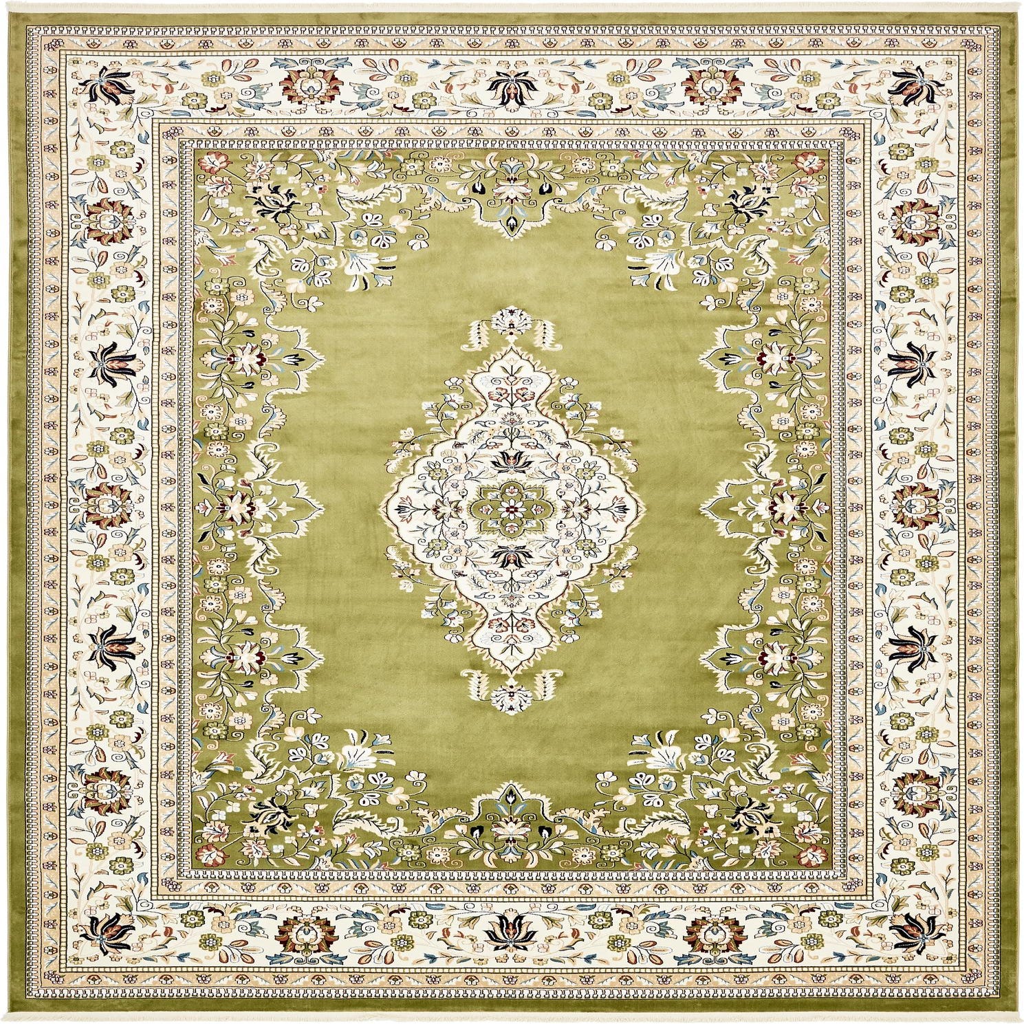 Primary color is Green. Colors in this rug include: Green, Blue, Burgundy, Cream, Ivory, Navy Blue, Plum Red, Tan.