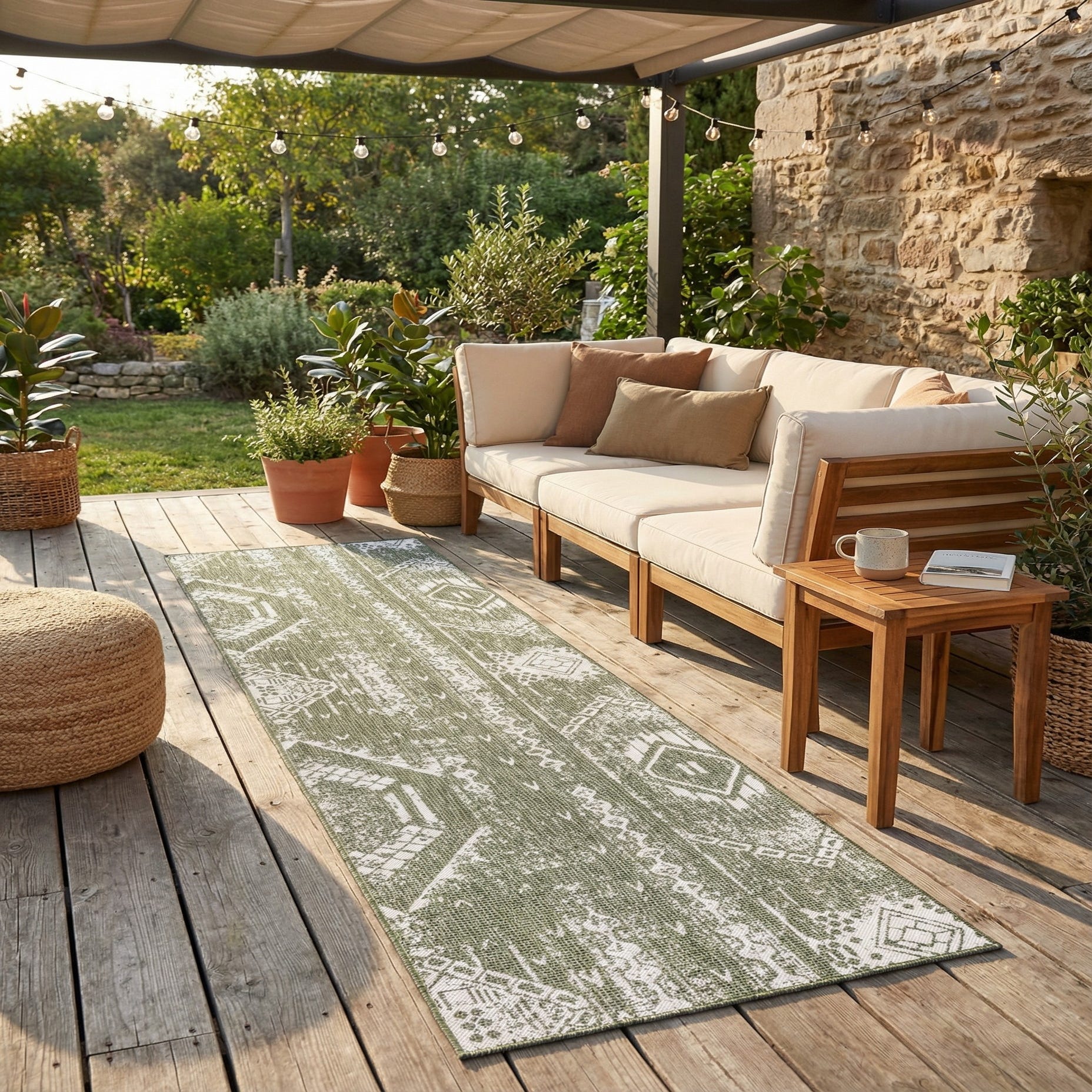 A 14 ft runner rug in shades of green with a distressed modern geometric pattern, suitable for a hallway or patio.