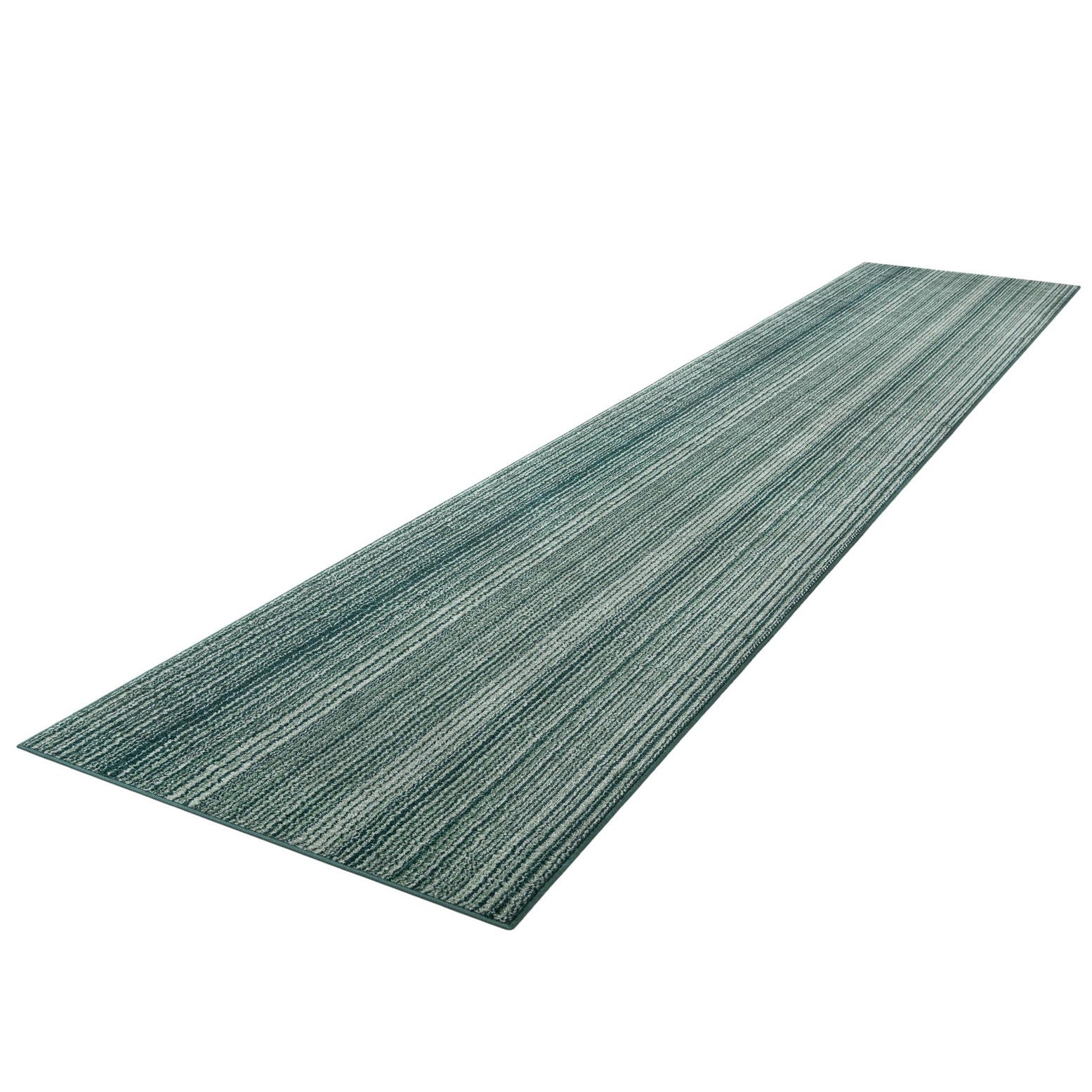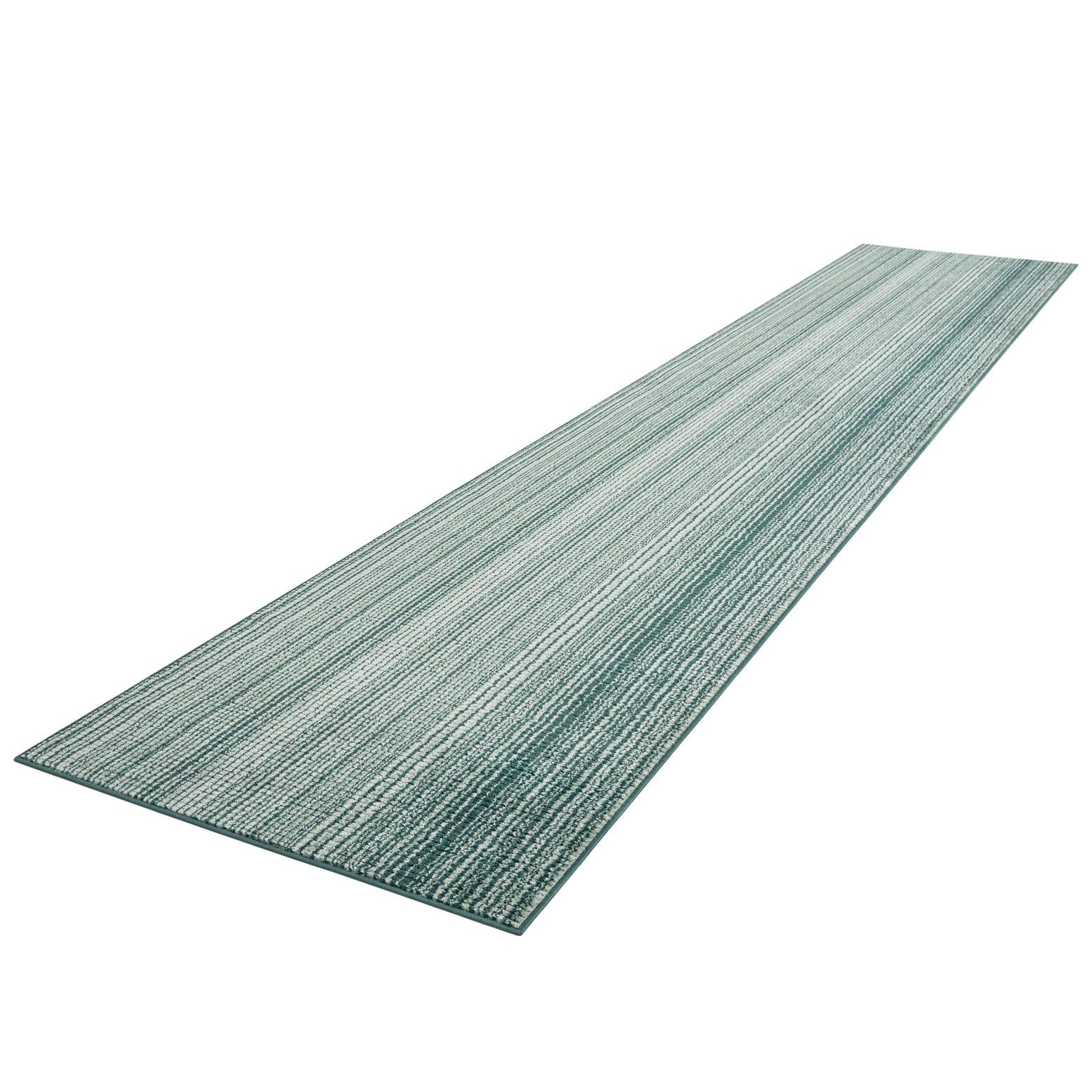 A long, linear field of narrow striations gives this runner a calm, directional pattern. Greens layer across the surface — a deep green background threaded with light green and olive highlights — creating subtle tonal movement rather than bold contrast. The machine-made polypropylene construction yields a low, dense pile with a slightly ribbed texture you can feel beneath your feet; the weave reads as textured yet streamlined, making the pattern feel modern and grounded.