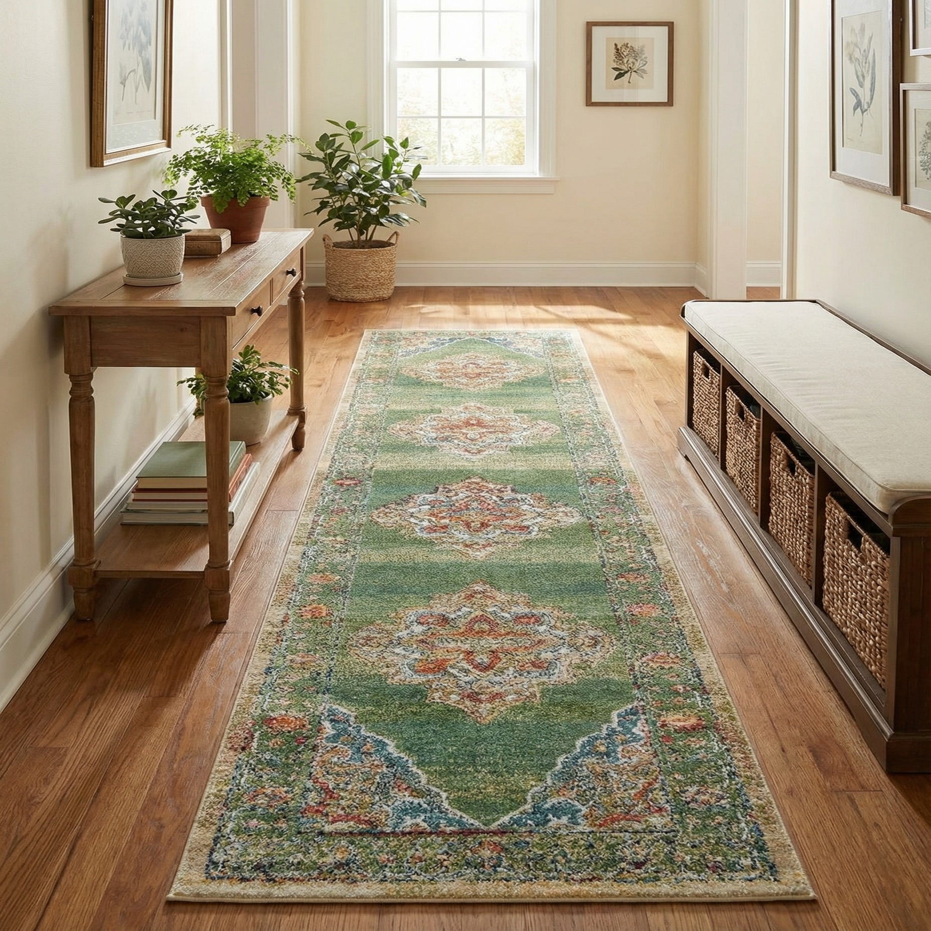 A 16 ft green runner rug with a distressed traditional medallion pattern in shades of red, blue, and beige.